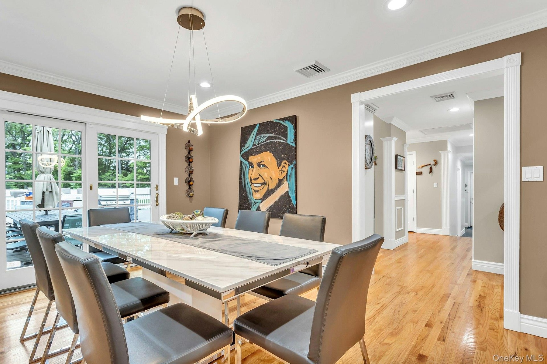 - Dining room featuring light wood-style flooring, a chandelier, crown molding, baseboards, and recessed lighting