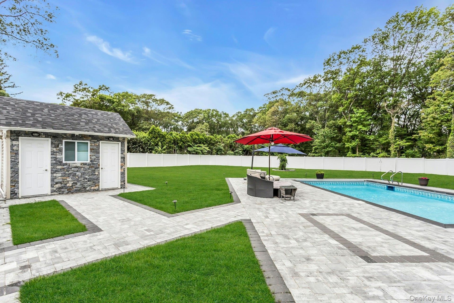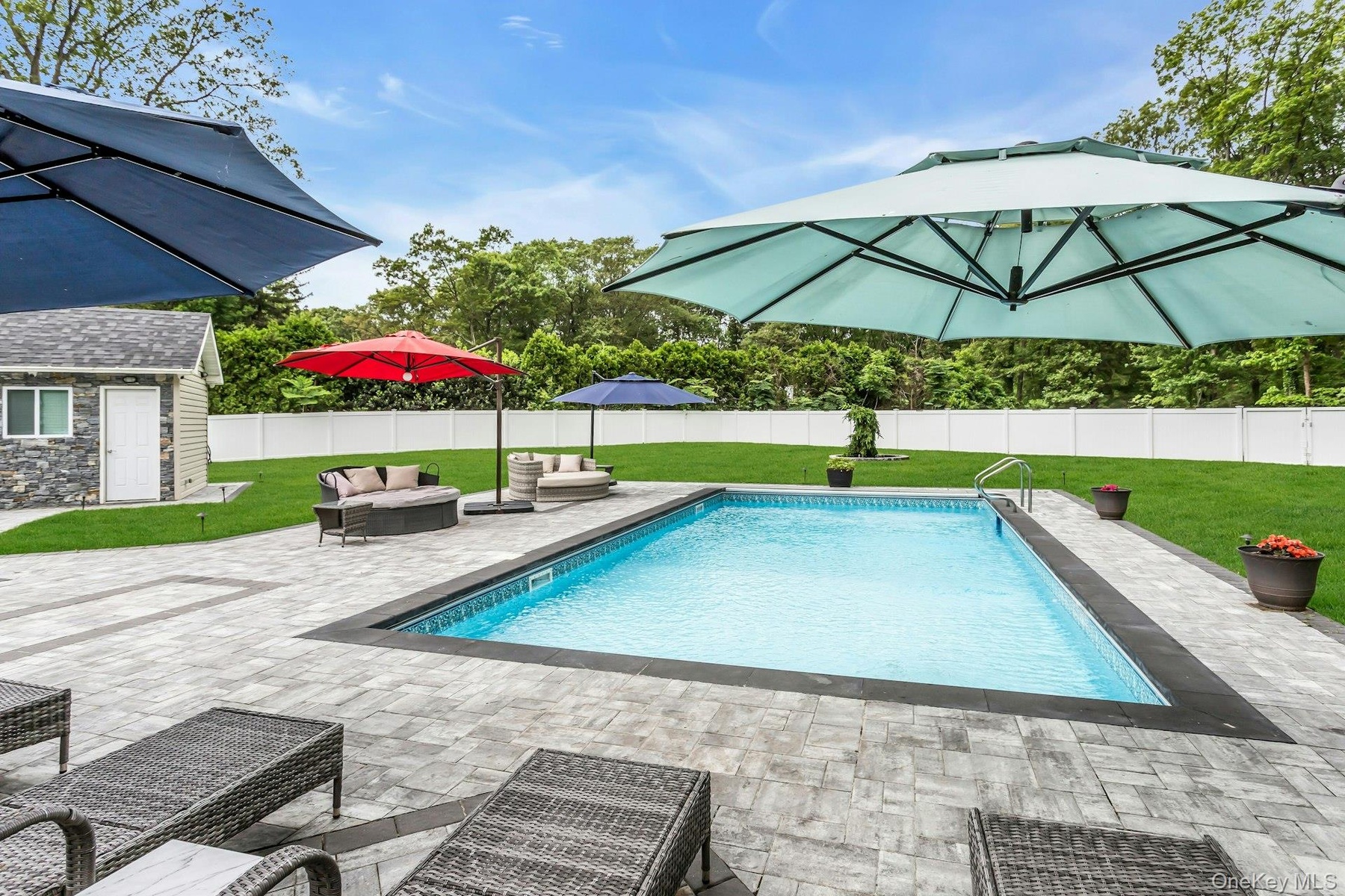 - View of swimming pool with a patio, an outdoor structure, and an outdoor living space
