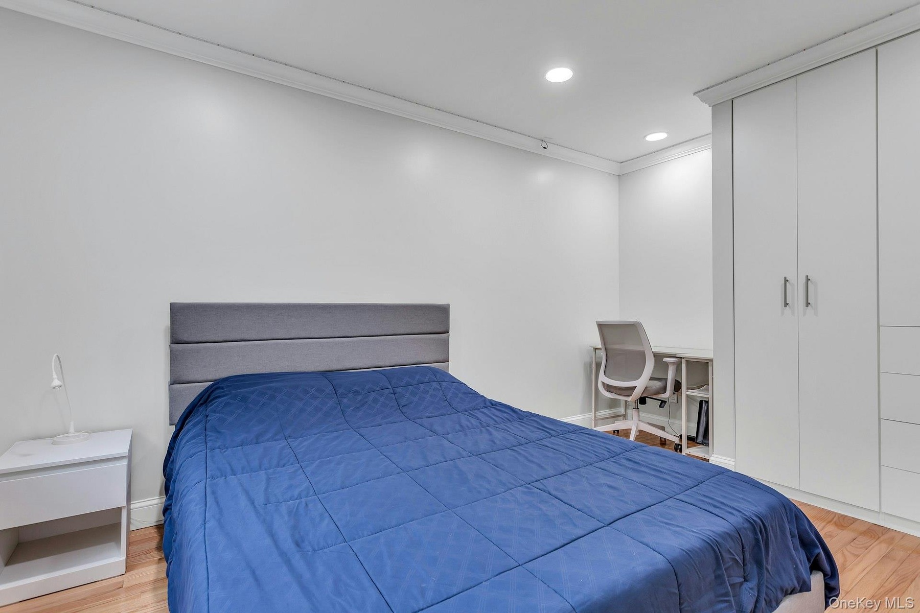- Bedroom featuring ornamental molding, light wood-style flooring, recessed lighting, and baseboards