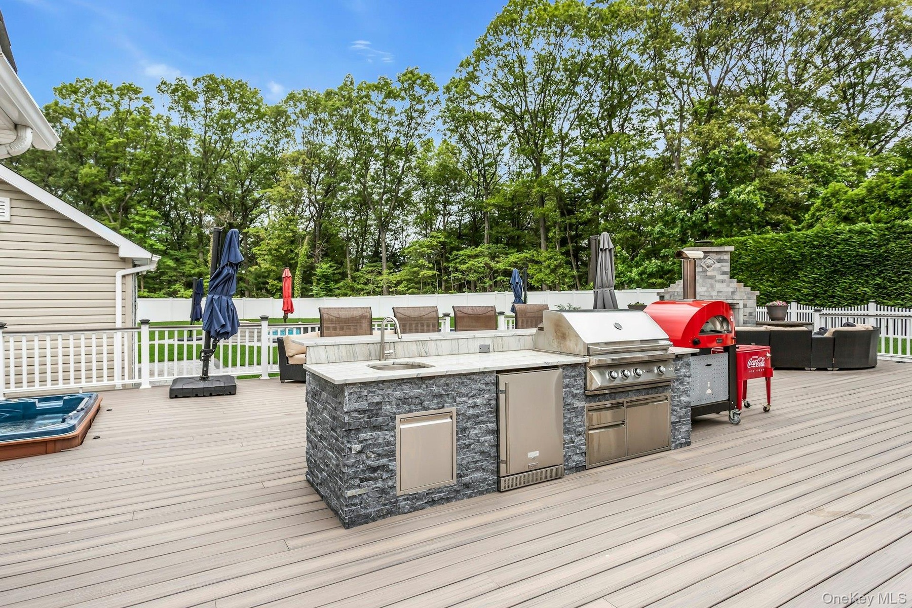 - Deck featuring a sink, view of wooded area, and an outdoor living space