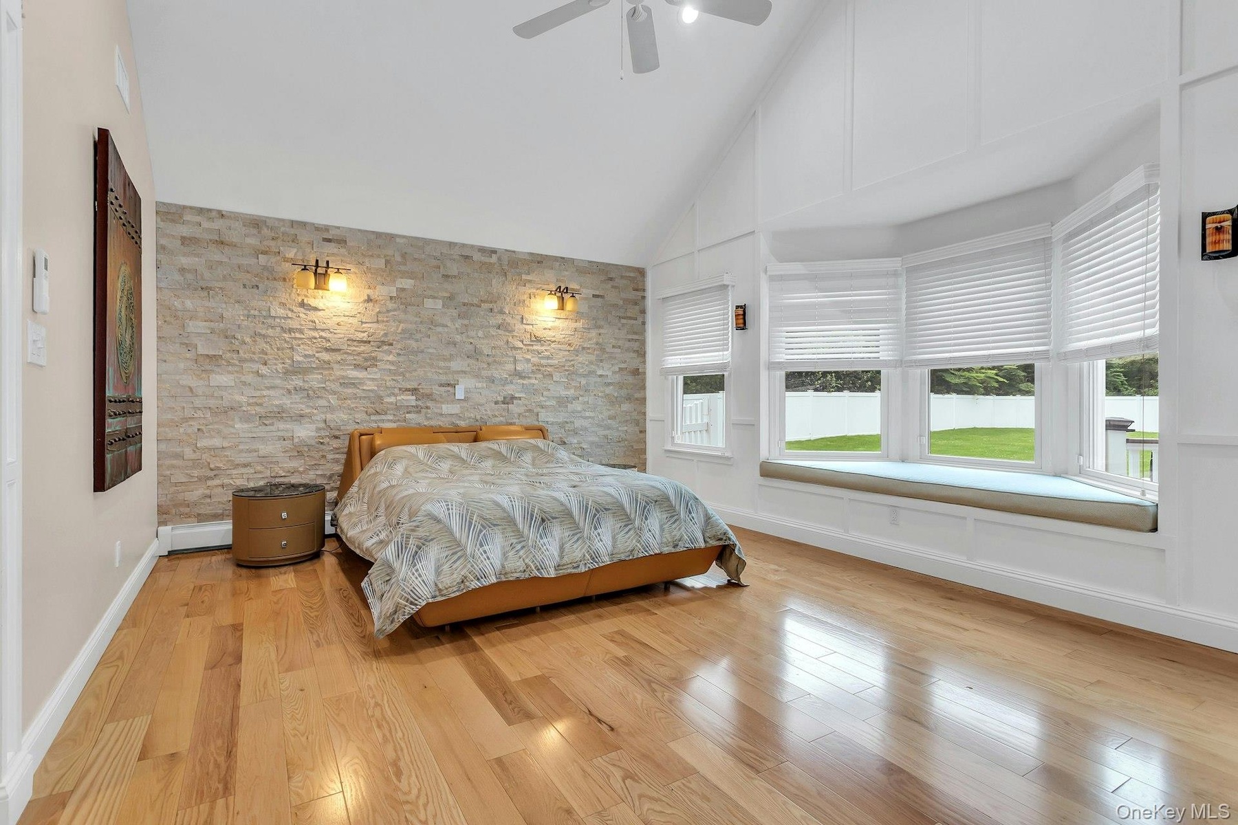 - Bedroom with multiple windows, wood finished floors, high vaulted ceiling, and ceiling fan