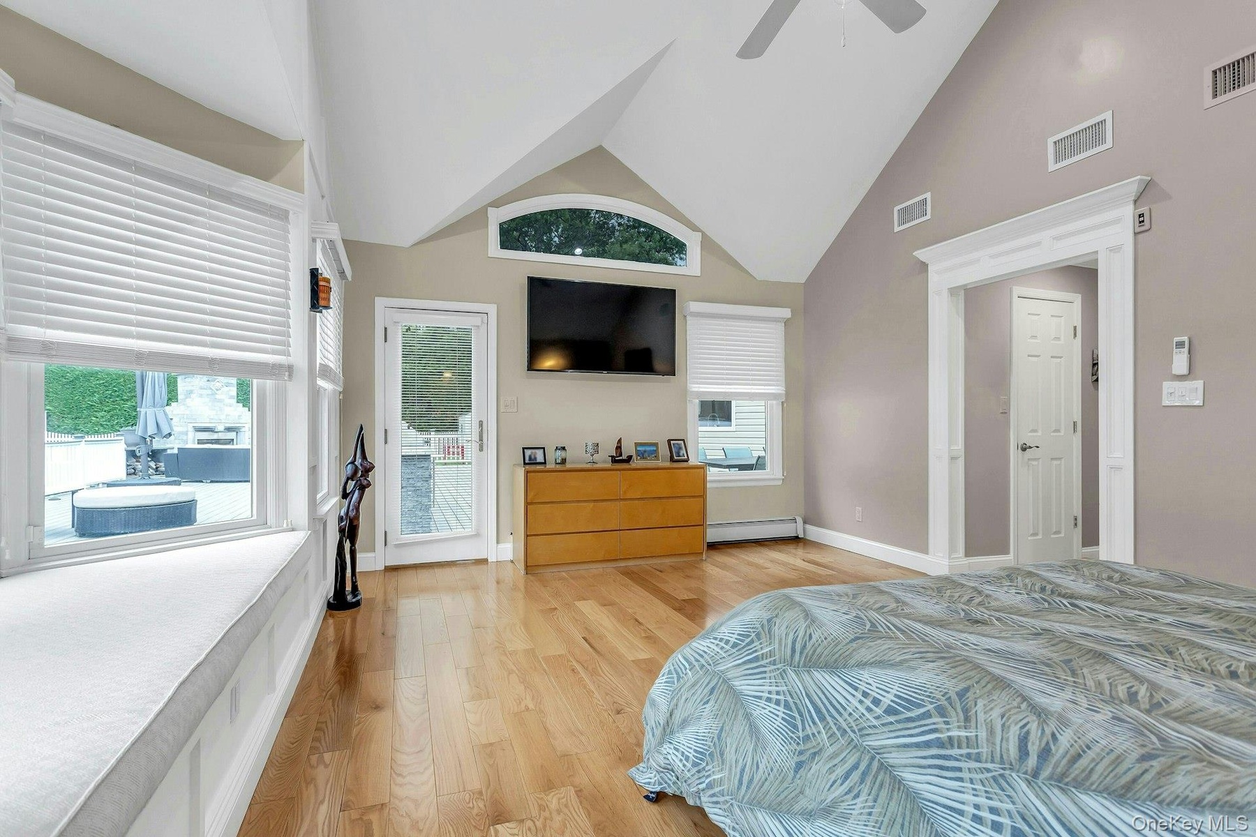 - Bedroom with light wood-style flooring, a baseboard radiator, a ceiling fan, baseboards, and high vaulted ceiling