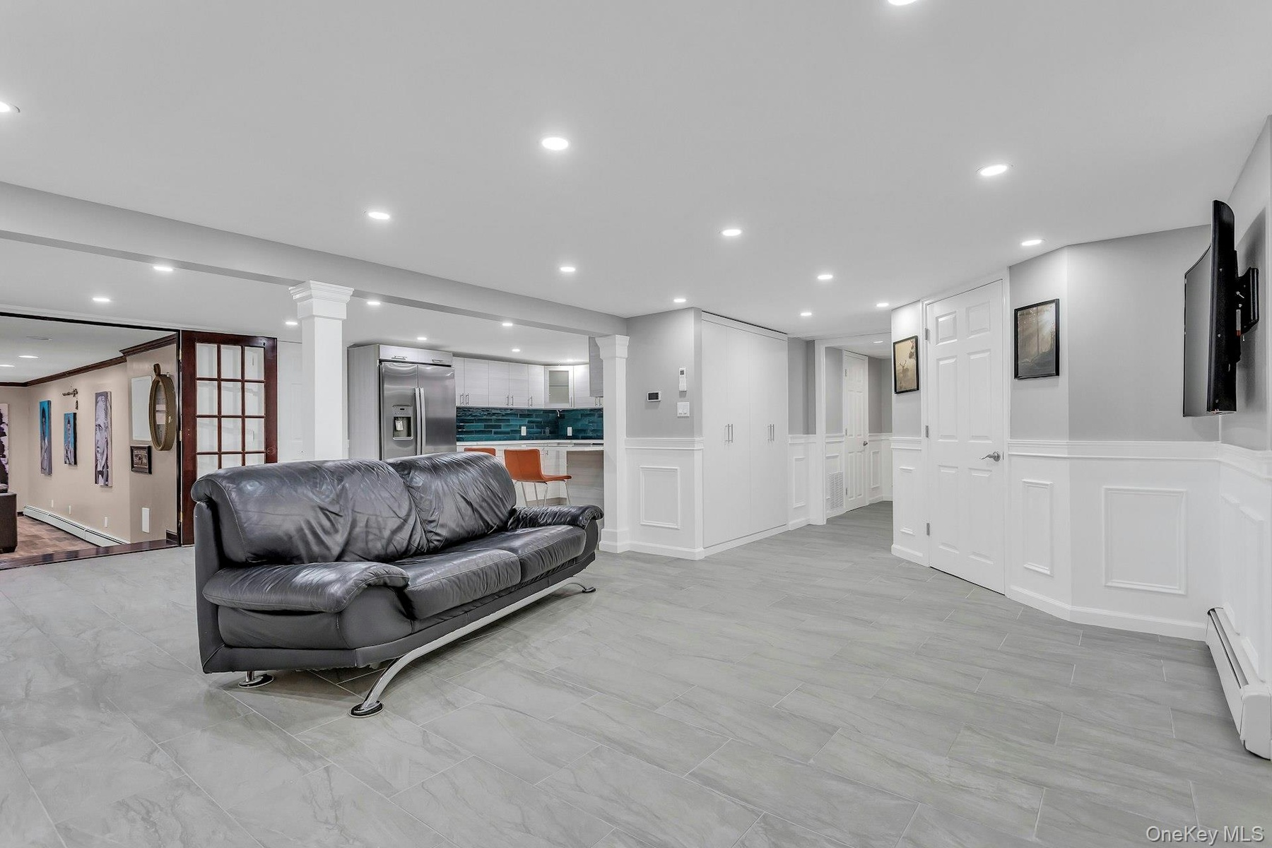 - Living room with decorative columns, a decorative wall, recessed lighting, wainscoting, and a baseboard heating unit