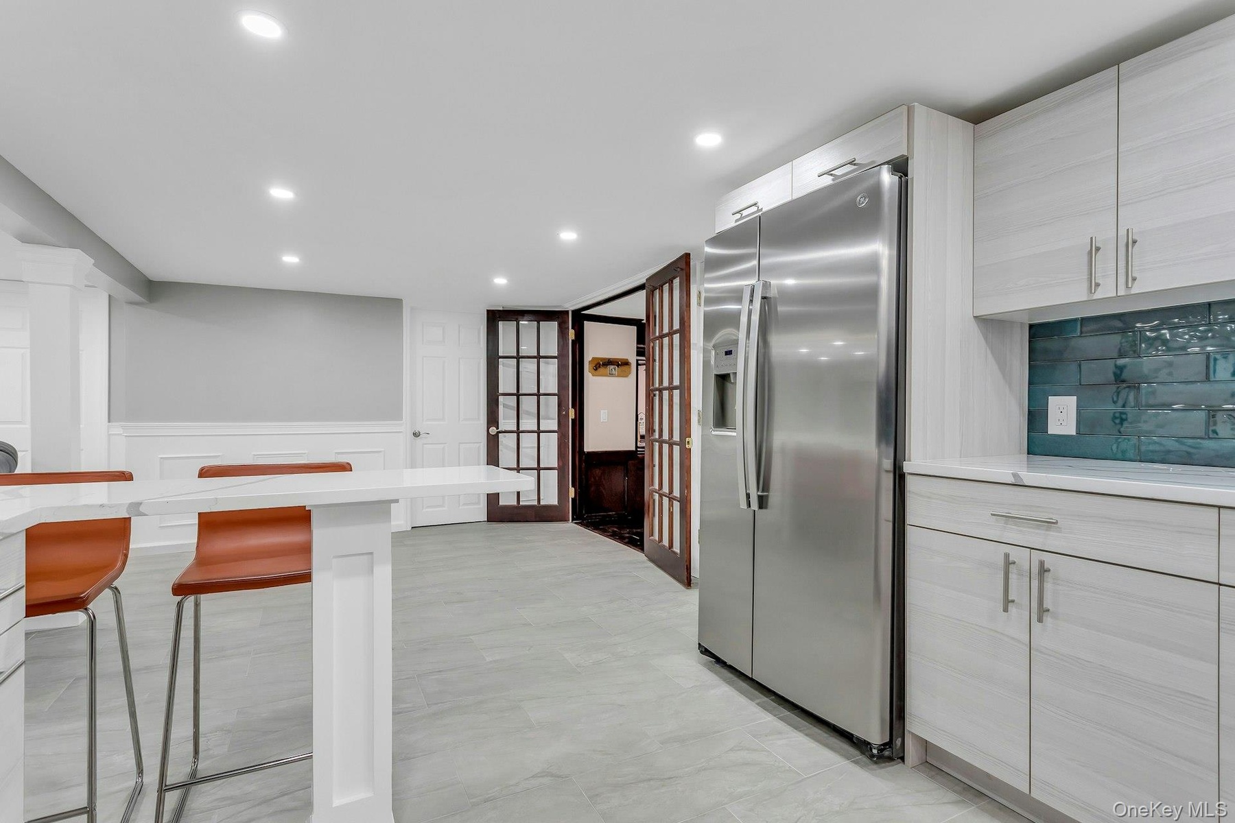 - Kitchen with stainless steel refrigerator with ice dispenser, a breakfast bar, recessed lighting, wainscoting, and light marble finish flooring