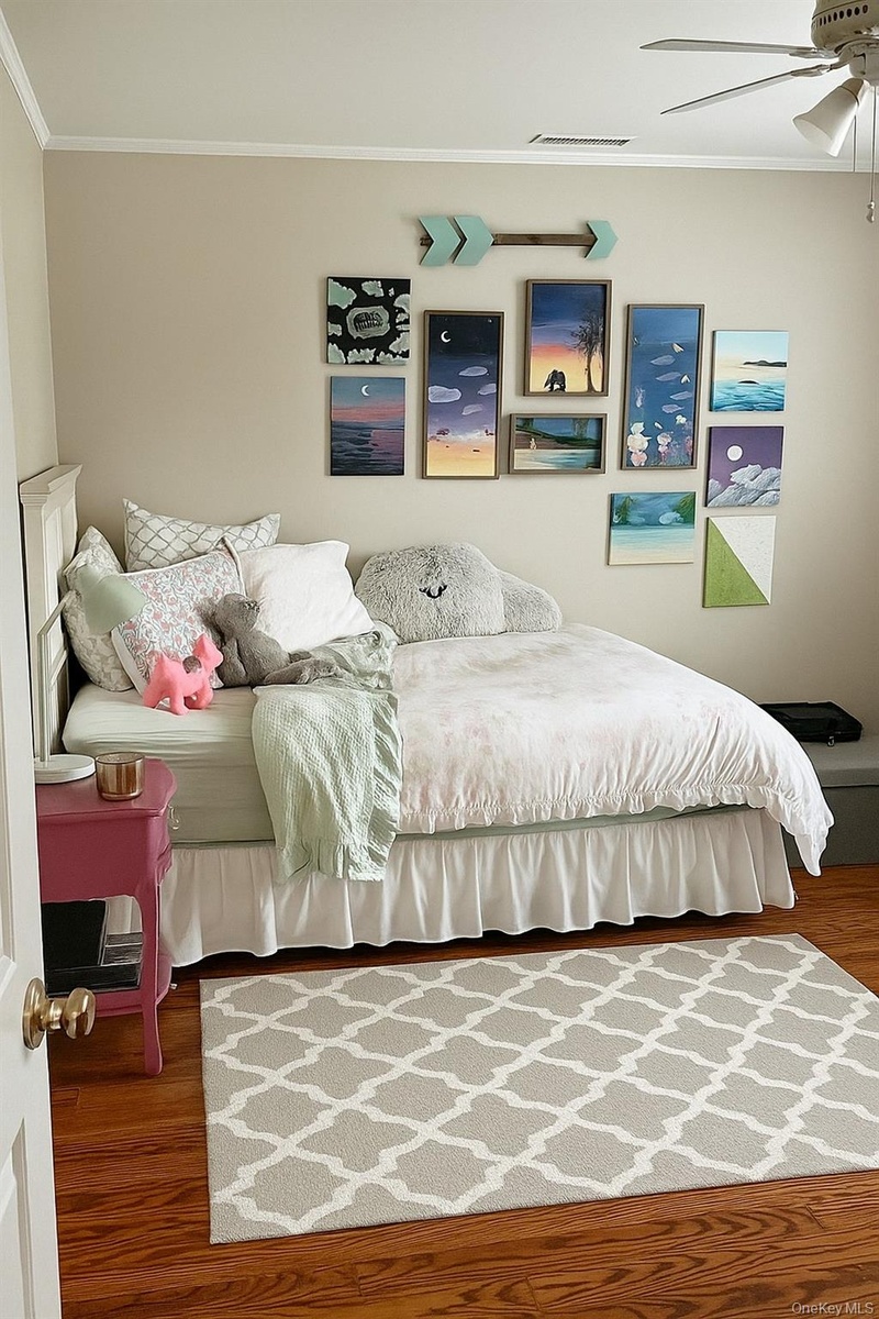 - Bedroom with crown molding, wood finished floors, and ceiling fan