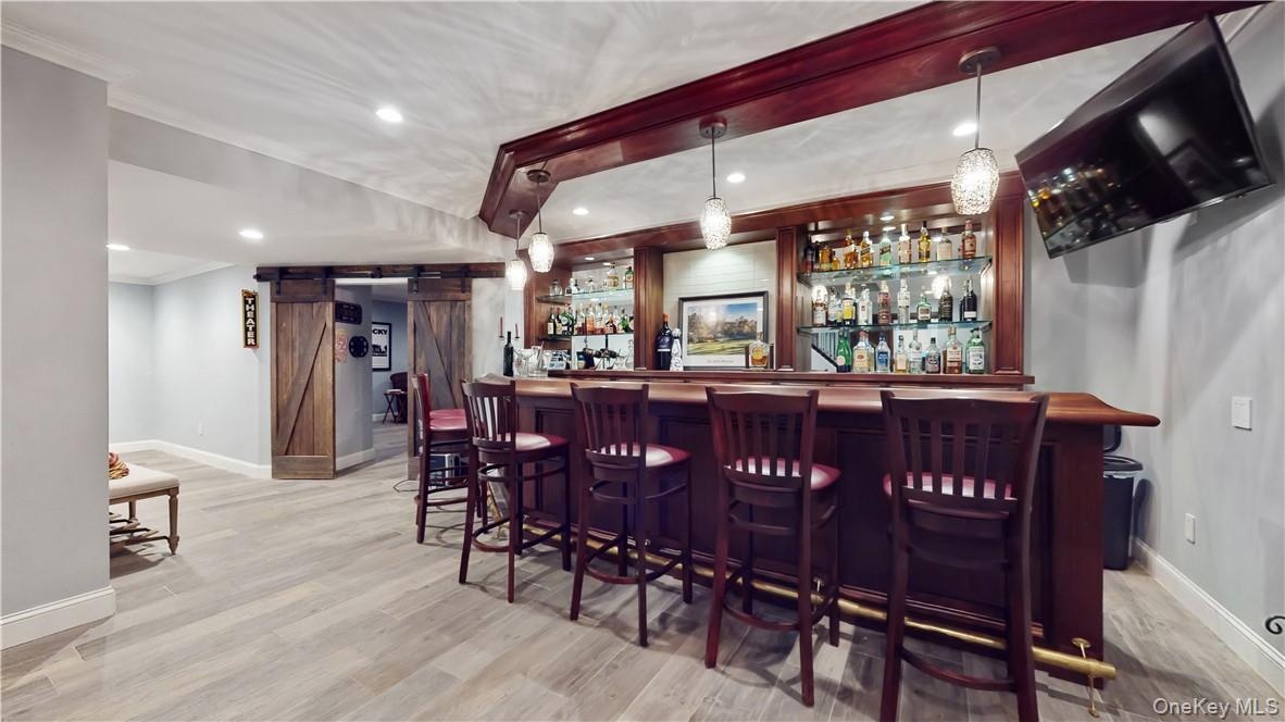 - Living area with wood finished floors, stairs, recessed lighting, and ornamental molding