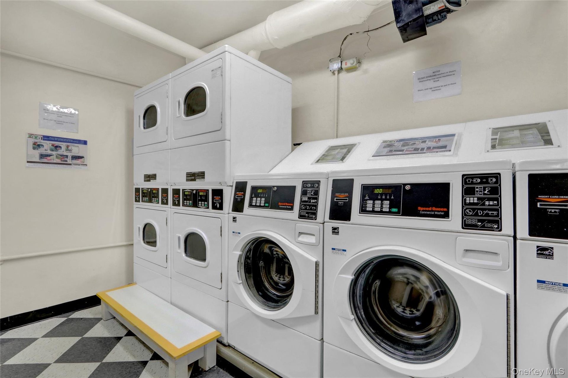 - Communal laundry room featuring washing machine and clothes dryer, stacked washer / dryer, and tile patterned floors