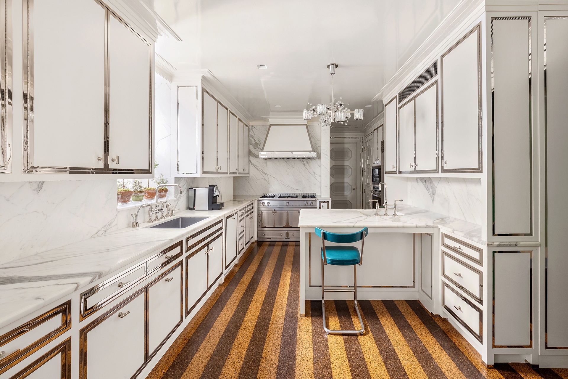 The large eat-in kitchen is outfitted with top-of-the-line appliances, a comfortable sitting and breakfast area, and a walk-in pantry. Beyond lies a spacious laundry room and a flexible staff room or office with its own powder room.