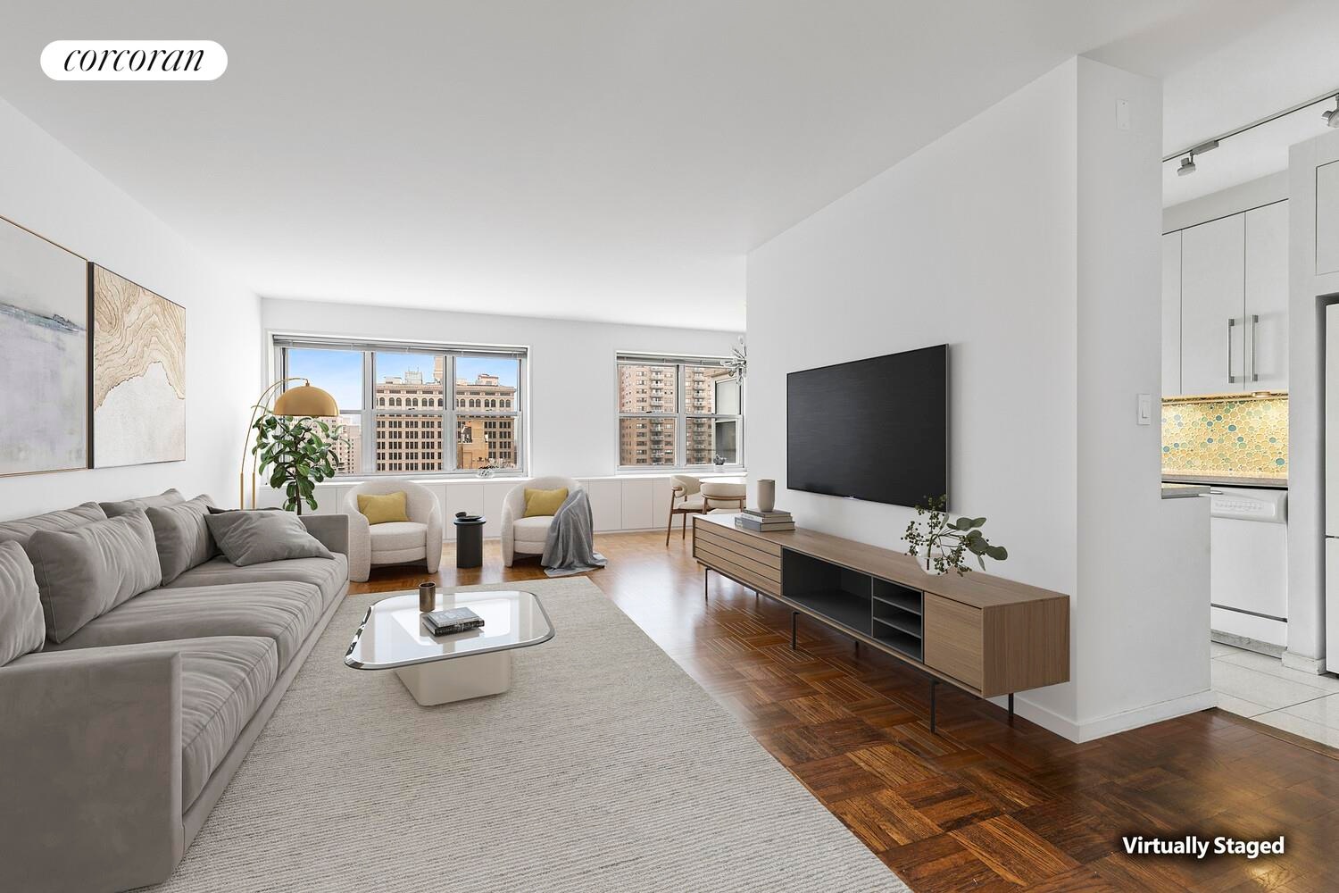 As you enter through the expansive foyer, you're guided into a 30-foot-long living room with a flexible configuration. The dining alcove easily transforms into a home office or guest area-perfect for modern living with postwar charm in one of Manhattan's most iconic neighborhoods.