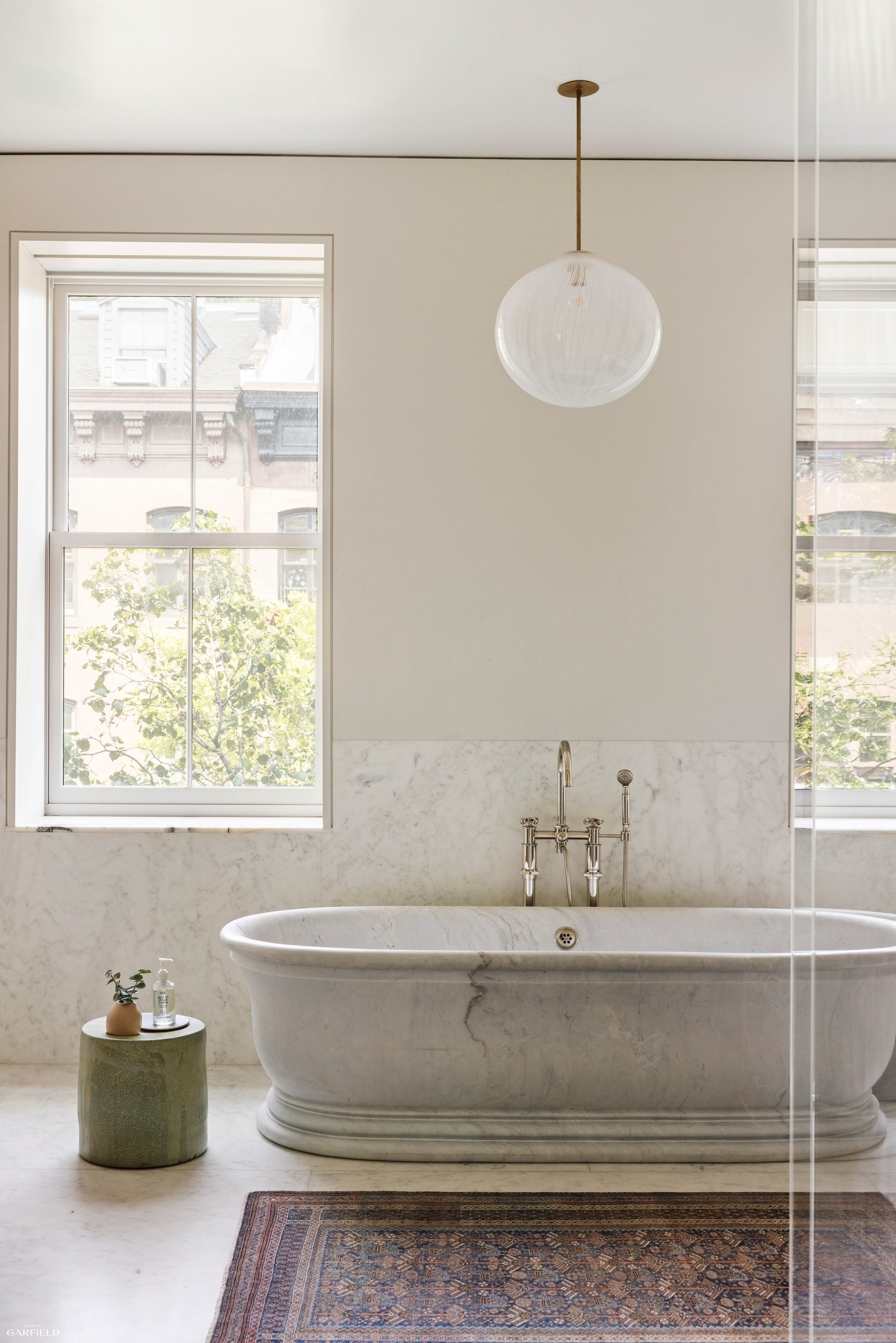 The bespoke kitchen—centered around a stately marble island—flows naturally into the bluestone garden, a secluded oasis ideal for al fresco dining with barbecue and entertaining. Each interior floor is over 60’ deep, allowing for graciously scaled rooms. The Parlor level features front and rear sitting rooms that can function formally and informally. Gracious ceiling height and south-facing light flood the rooms at all times of day.