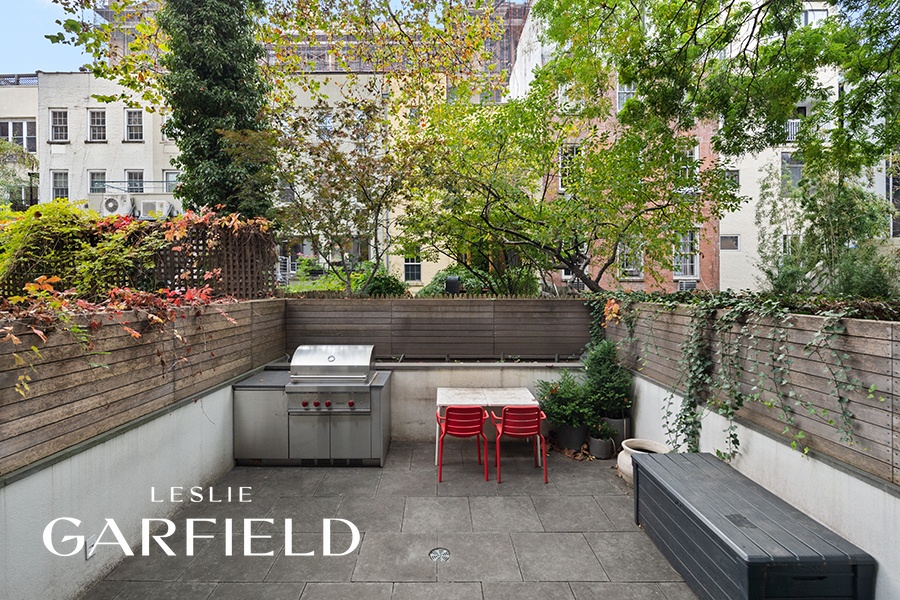 The top floor expansion has been framed with North and South full glass sliding doors and is presently used as a gym. Outdoor living is equally impressive, with a large north-facing terrace offering open views of Hudson Yards, the Empire State Building, and Lower Manhattan. The sun-soaked roof deck includes a south-facing exposure, outdoor shower, kitchenette, and built-in barbecue—an ideal setting for entertaining or unwinding above the city.