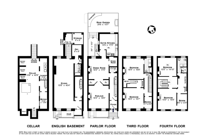 The top two floors of the house are bathed in natural light and offer four large bedrooms each with a wood-burning fireplace, and two separate studies that easily convert to additional bedrooms. The ground floor English Basement extends the full footprint of the house and is currently an open plan with unlimited potential. Accessed from either the parlor level or underneath the front stoop, this expansive space offers numerous options including additional bedrooms, a private office or a separate guest apartment. The full cellar below is finished as a home gym and offers a large separate laundry room and endless amounts of storage. Additional amenities include multi-zoned central air-conditioning, custom-milled bookshelves, copious amounts of storage and a charming powder room for guests.