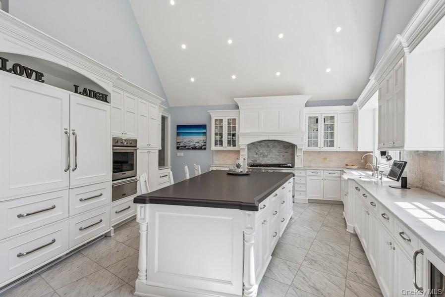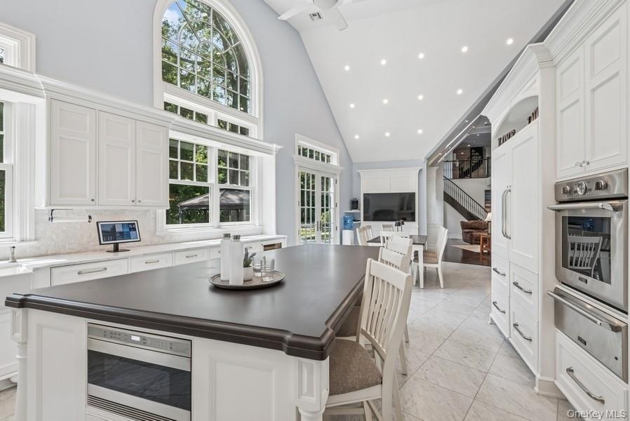 - Kitchen featuring high vaulted ceiling, white cabinets, and a kitchen island with stone, marble floors and counter tops.