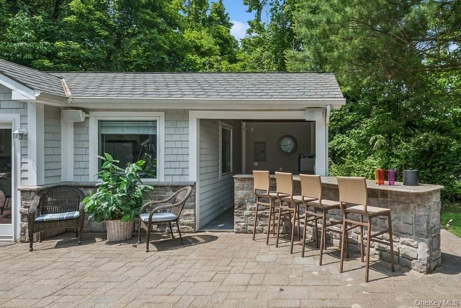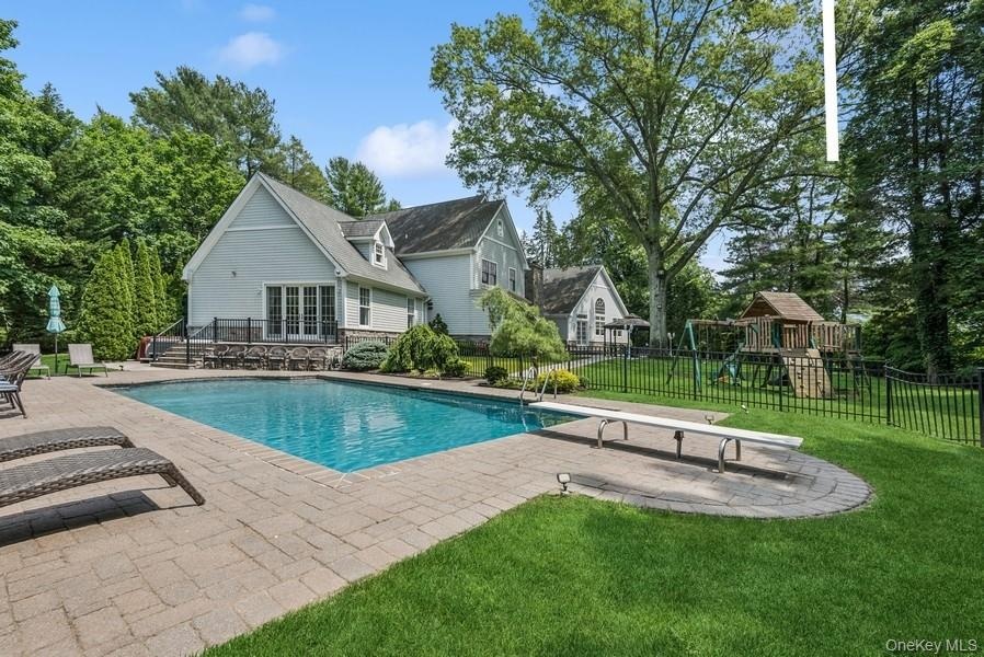 - Gunite Swimming pool with a patio area, view of wooded area, and pool house
