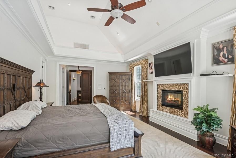 - Bedroom featuring a fireplace, wood finished floors, vaulted ceiling, and ceiling fan