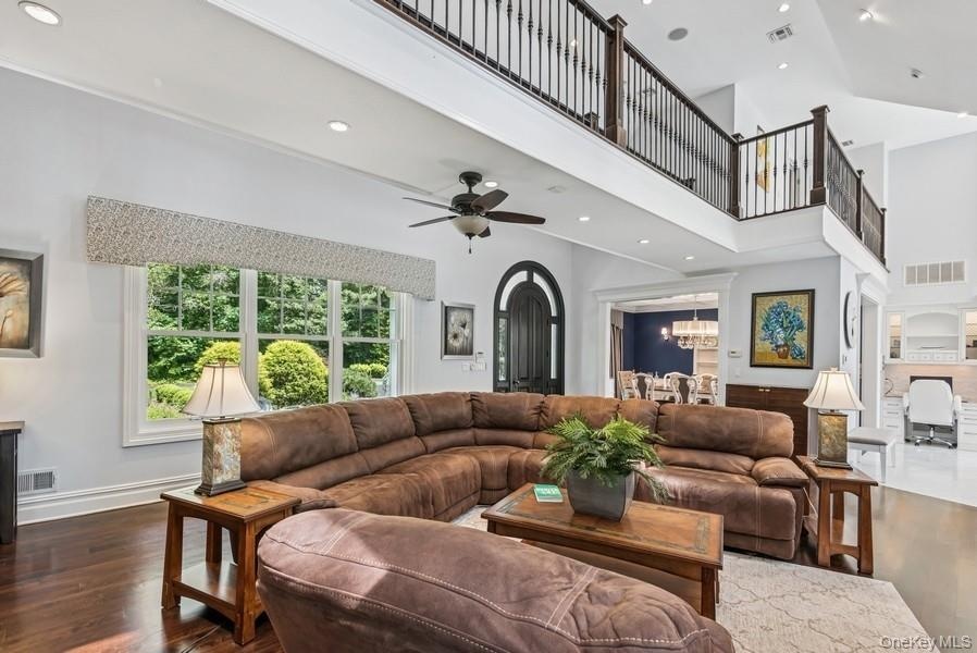 - Great Room/Living room with wood finished floors, a high ceiling, ceiling fan, recessed lighting, ceiling fan, built-ins, custom millwork