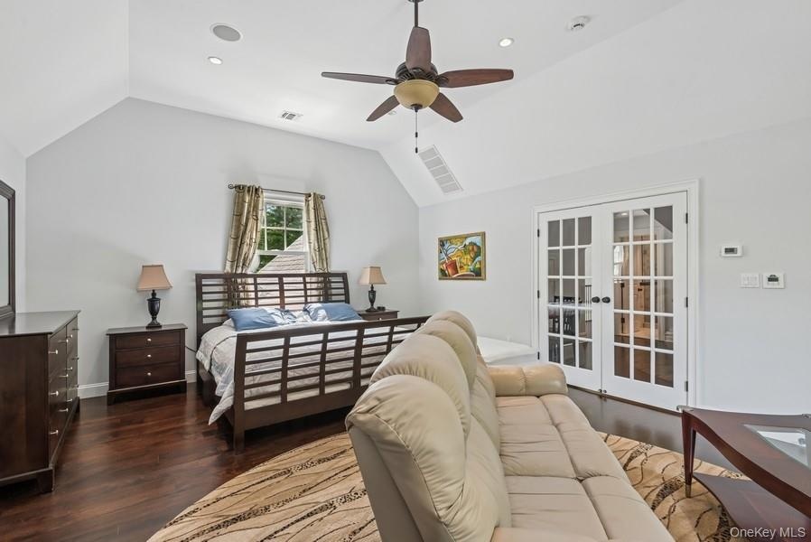 - Bedroom with french doors, vaulted ceiling, wood finished floors, ceiling fan, and recessed lighting