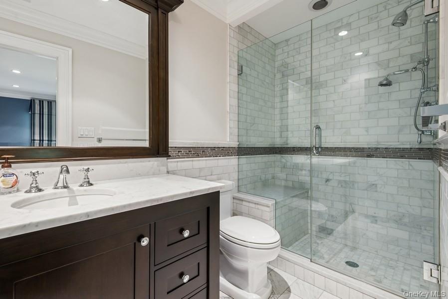 - Bathroom with ornamental molding, vanity, toilet, a shower stall, and tile walls