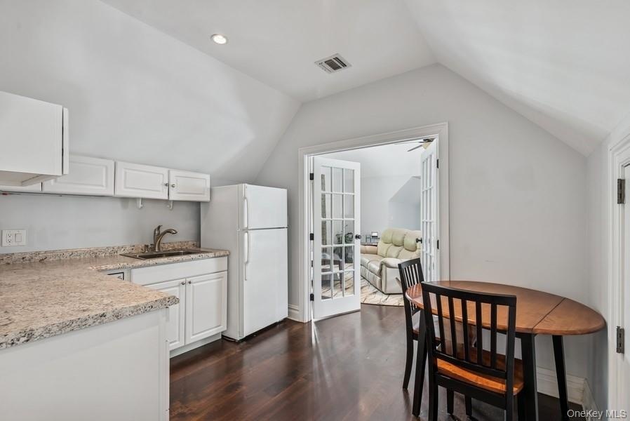 - Kitchenette featuring freestanding refrigerator, vaulted ceiling, sink, dark wood finished floors, and white cabinets