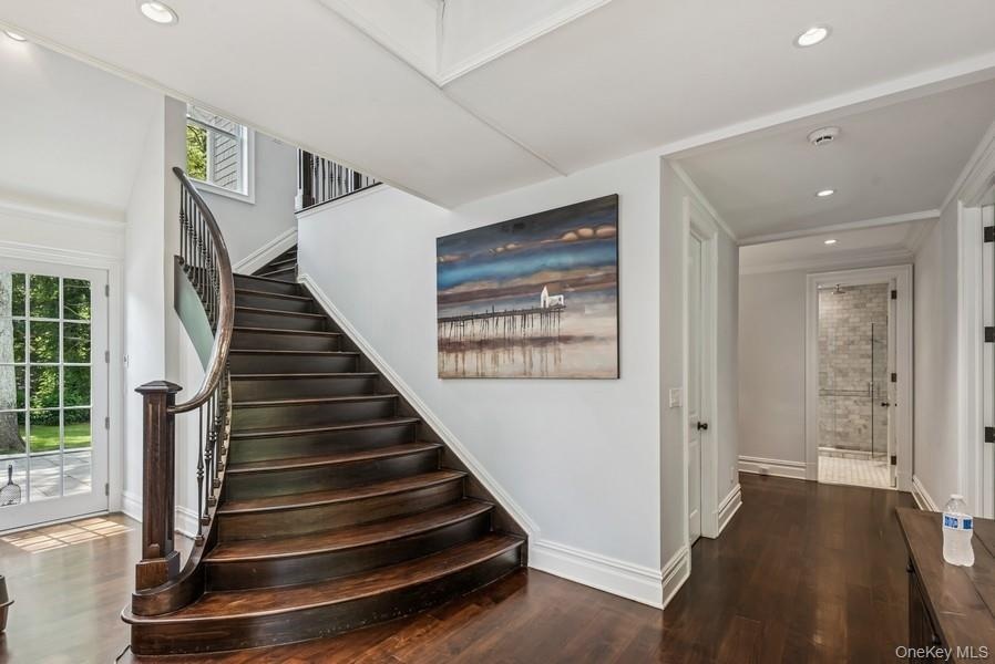 - Staircase with wood finished floors, recessed lighting, and crown molding