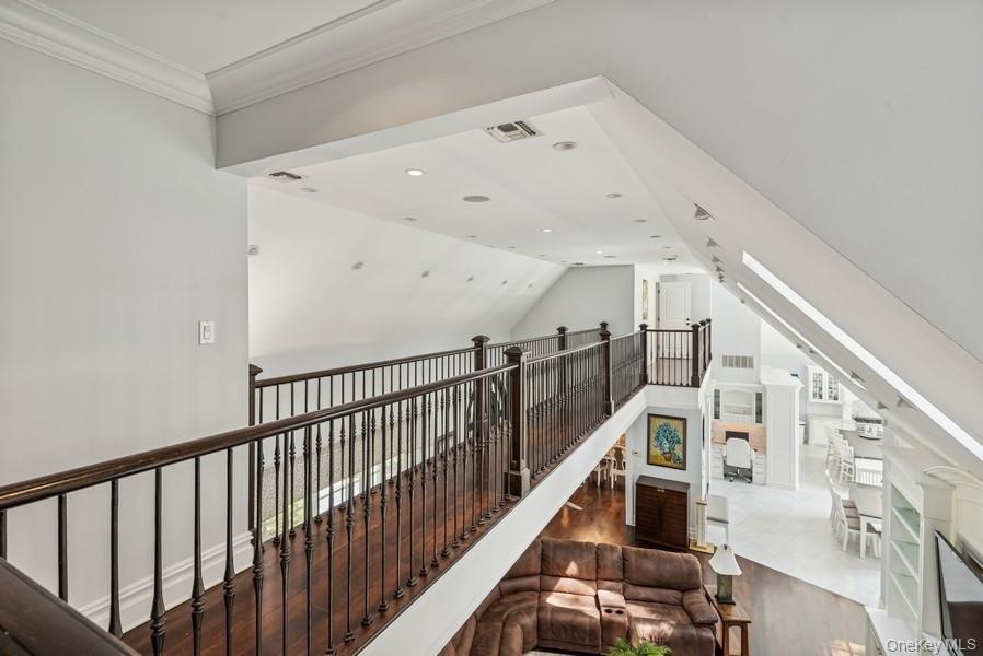 - Staircase with wood finished floors, ornamental molding, lofted ceiling, and recessed lighting