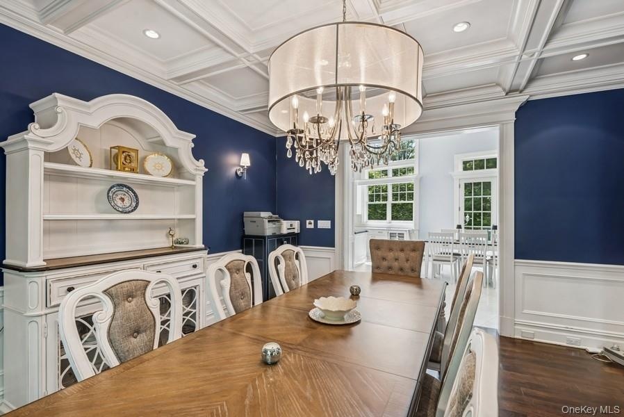 - Dining Room with coffered ceiling, ornamental molding, a chandelier, and wainscoting