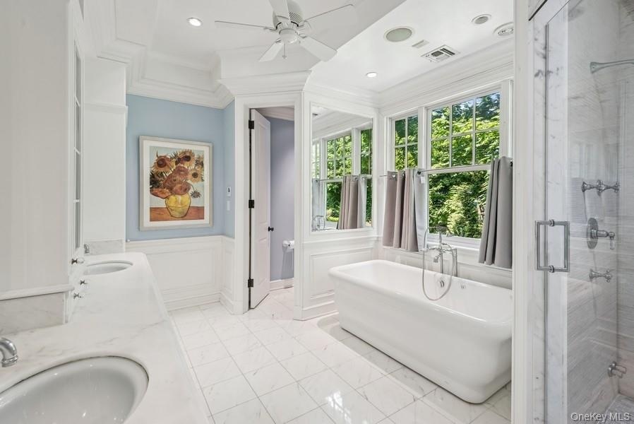 - Bathroom featuring a soaking tub, a shower stall, a ceiling fan, ornamental molding, and wainscoting
