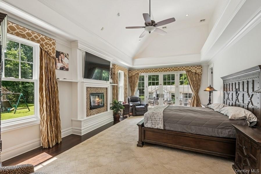 - Bedroom featuring french doors, multiple windows, a glass covered fireplace, access to outside, and high vaulted ceiling
