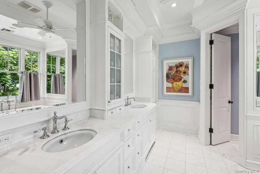 - Bathroom featuring ceiling fan, crown molding, double vanity, marble finish floors, and a wainscoted wall