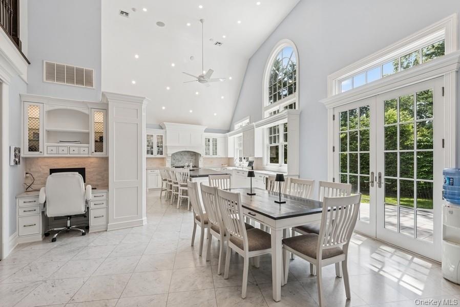 - Dining area with high ceiling, French doors leading to patio, ceiling fan, and recessed lighting