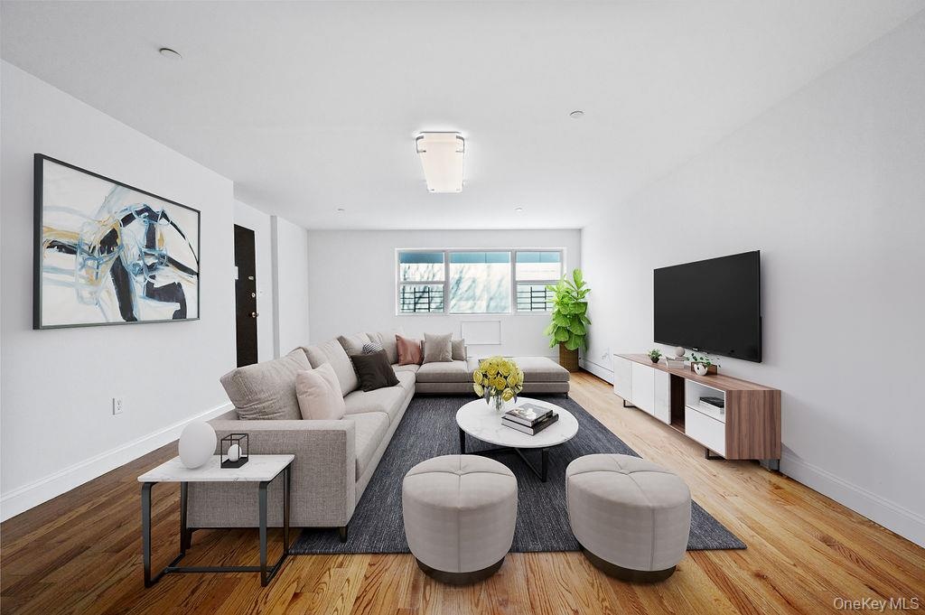 - Unfurnished living room with a baseboard radiator, light wood-style flooring, and baseboards