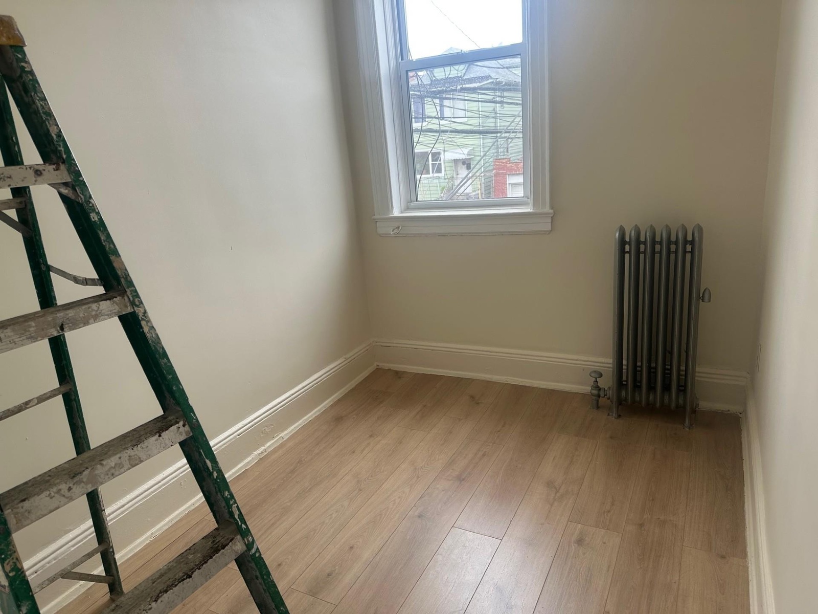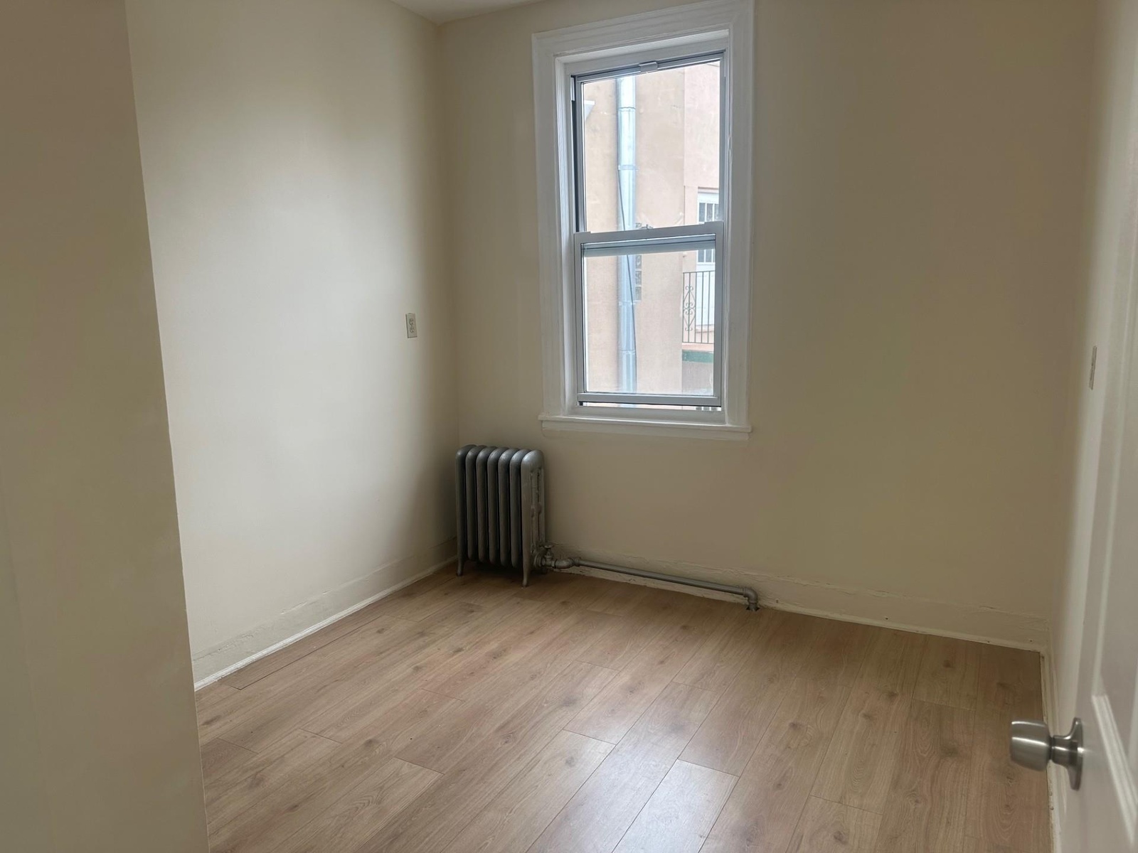- Unfurnished room with radiator, light wood-style flooring, and baseboards