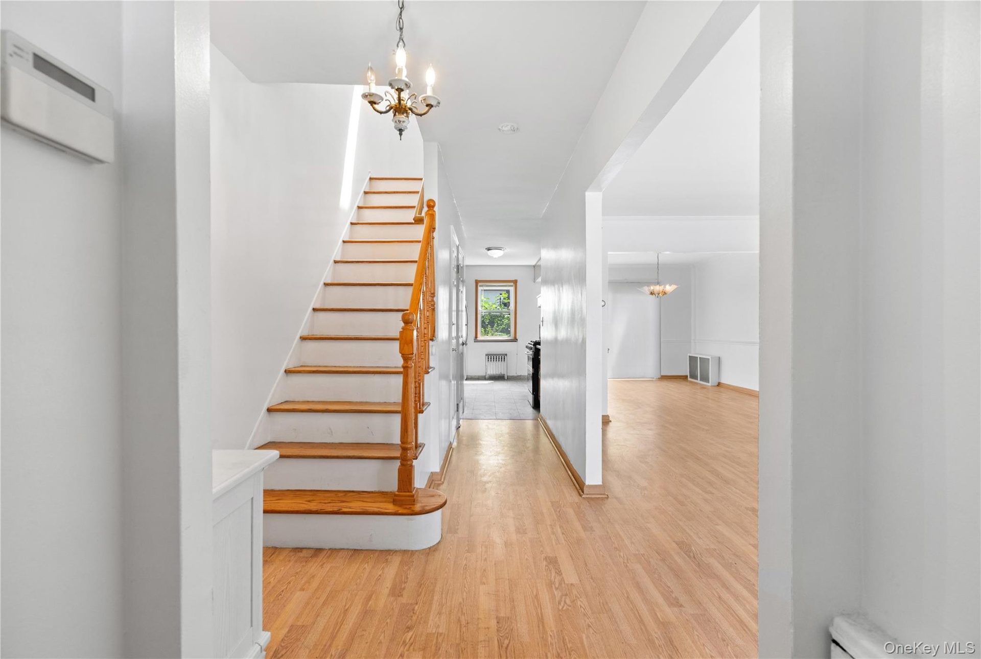 - Stairs featuring a chandelier, wood finished floors, baseboards, and radiator