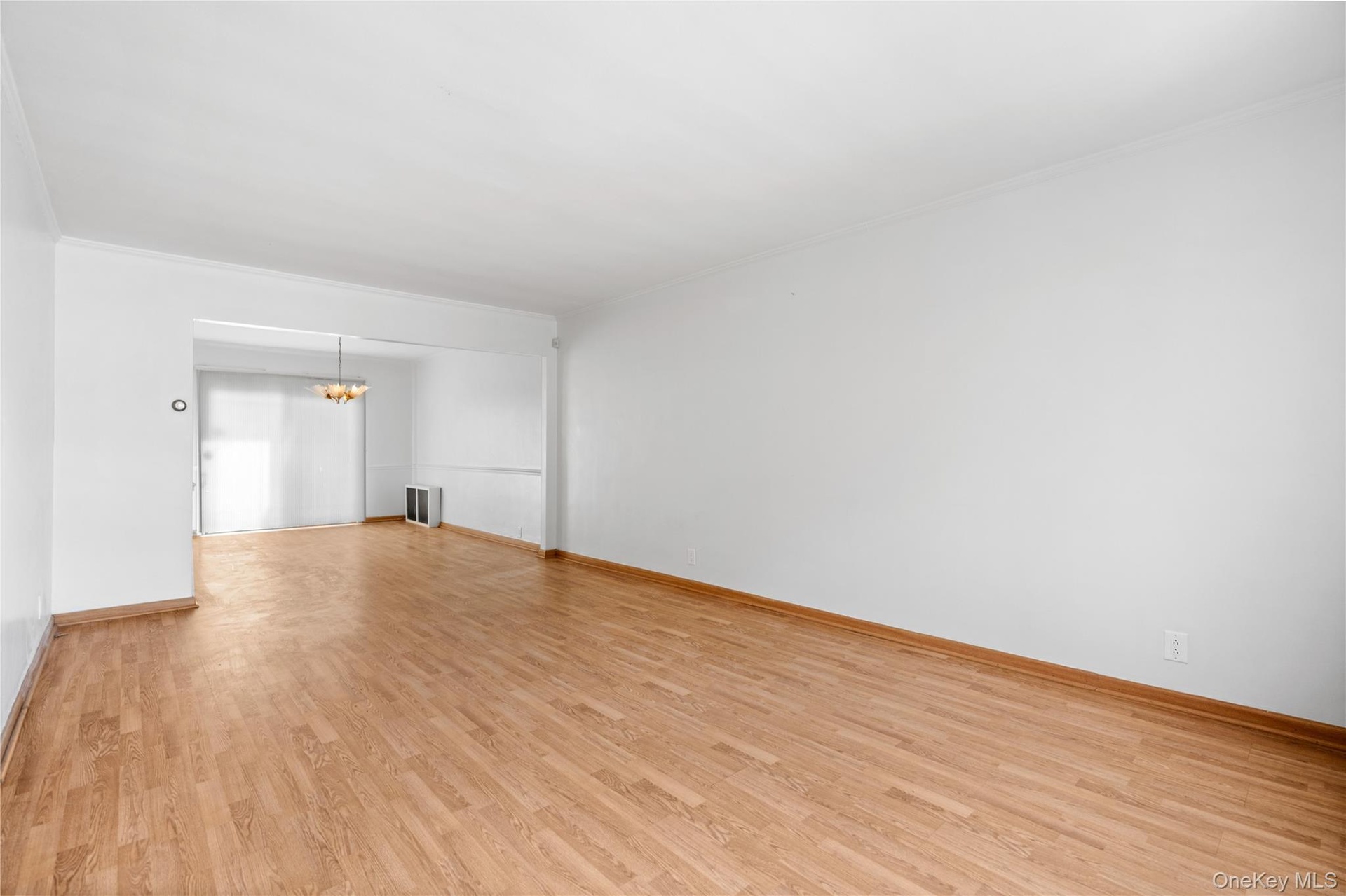 - Unfurnished living room with a chandelier, light wood-style floors, baseboards, ornamental molding, and radiator heating unit