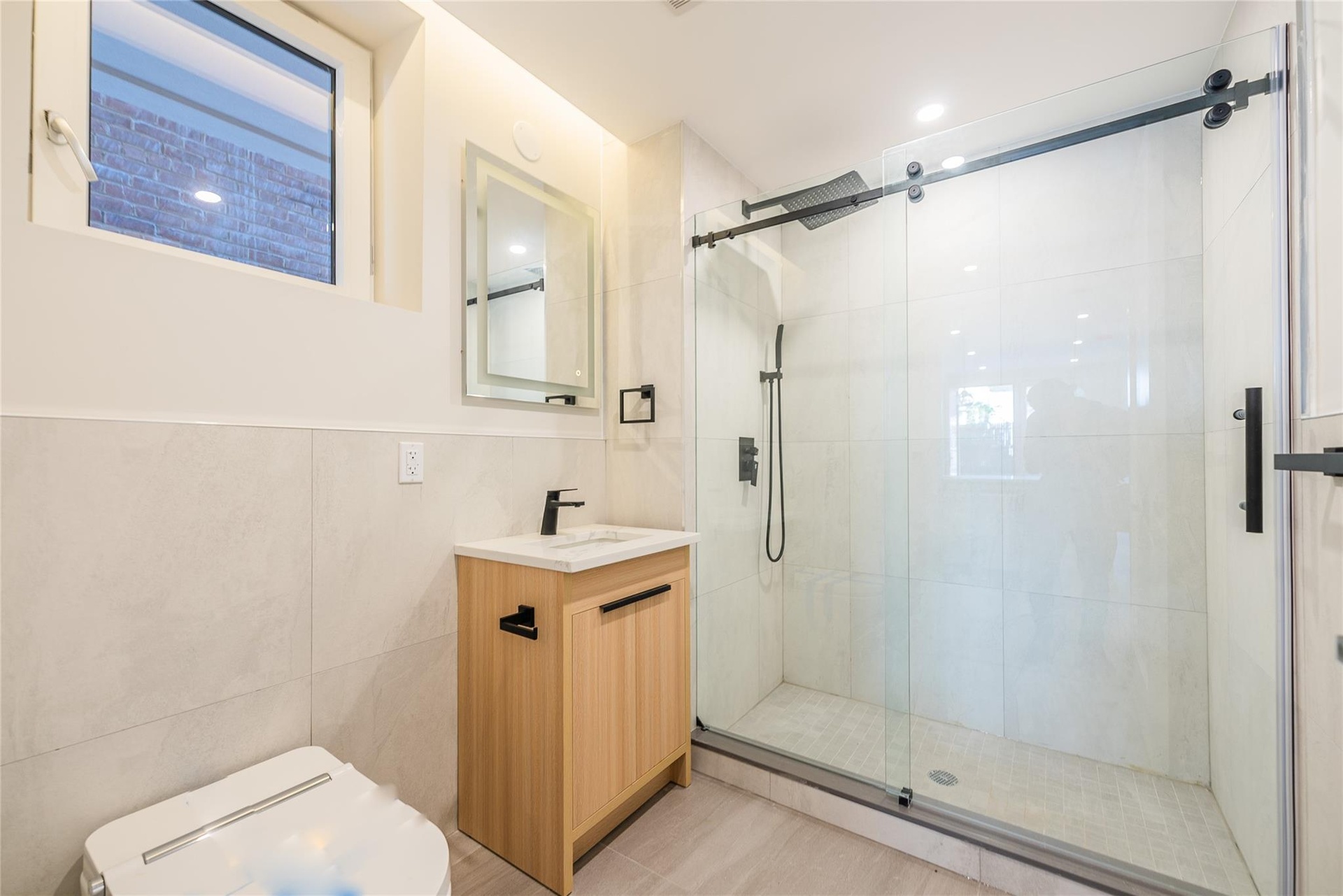 - Bathroom featuring tile walls, vanity, a shower stall, and toilet