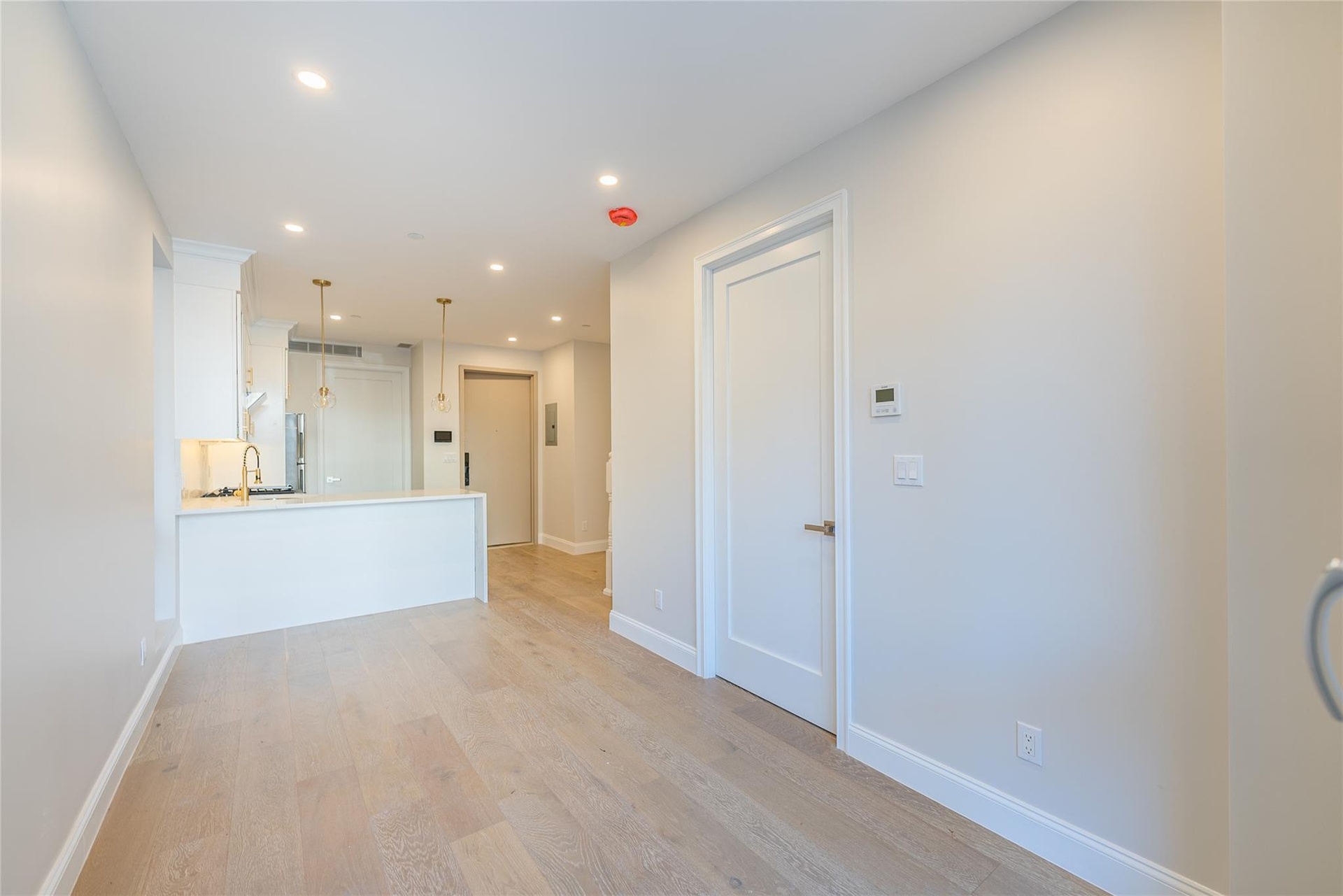 - Hall with light wood-style floors, baseboards, recessed lighting, and a sink