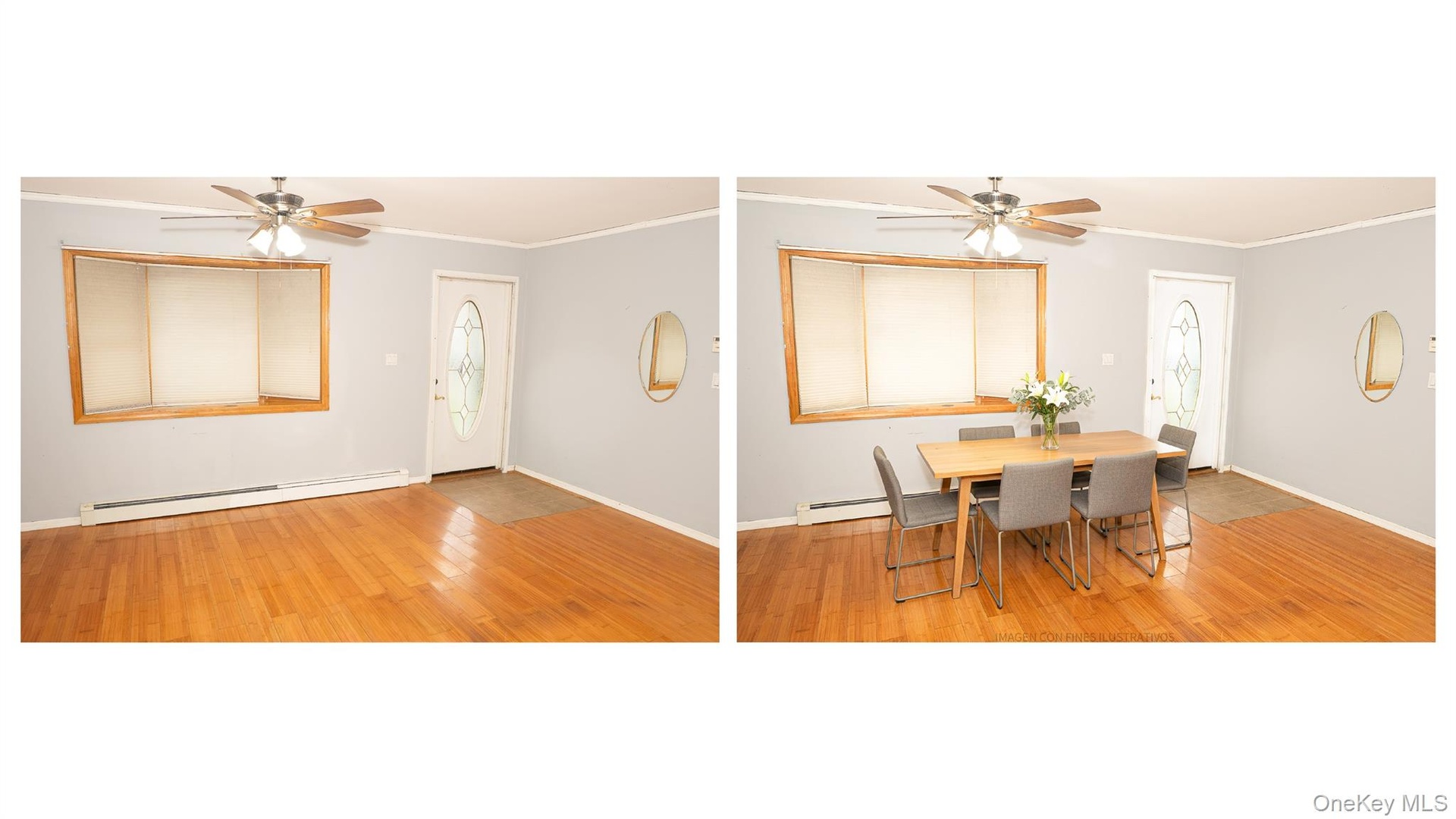 - Dining room with a ceiling fan, ornamental molding, light wood-style flooring, and a baseboard heating unit