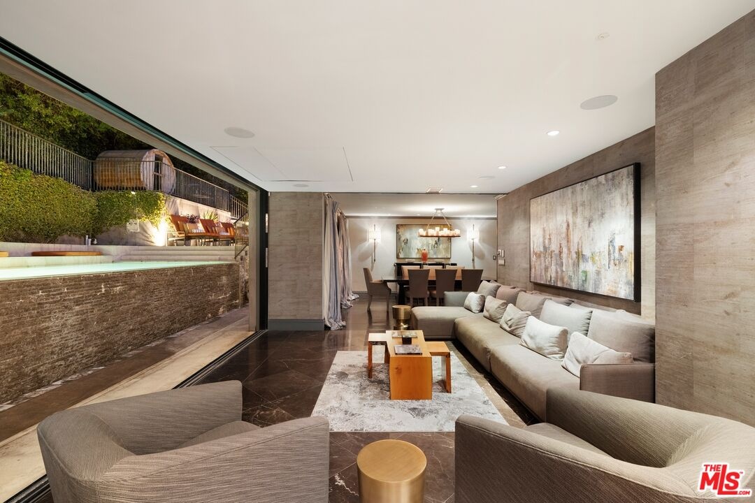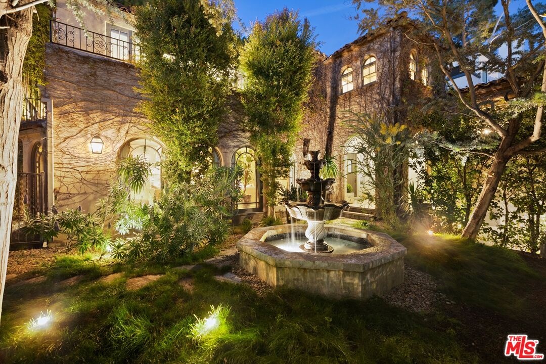 Exquisitely renovated and meticulously finished, this 3,558 sq.ft. ivy-covered Spanish estate near Lake Hollywood blends classic elegance with modern luxury. A step-down living room with an oversized original fireplace and expansive picture windows overlooks lush landscaping, while a formal dining room connects to a family/media room featuring a hidden drop-down, rotating TV and pocket sliding doors opening to an outdoor oasis. The gourmet chef's kitchen showcases top-tier appliances like a SubZero refrigerator, Miele ovens, Wolf range/cooktop, a center island, a breakfast area with French doors, and seamless indoor-outdoor flow, complemented by a full outdoor kitchen. Each en-suite bedroom is uniquely designed, with the primary suite offering a spa-like bath, a wall of closets, and a massive terrace overlooking the rear garden, infinity-edge pool, and greenery. Additional flexible spaces include a bonus room which can function as a gym, nursery, or fourth sleeping area. Smart home technology features a Control 4 system, Sonos, Nest HVAC, outdoor video surveillance, and iAqualink for the saline pool and spa (which also has a built-in automatic pool cleaning system). The outdoor retreat is complete with a reverse infinity-edge pool/spa, stone water wall, firepit, multiple terraces, outdoor dining and entertainment areas, an outdoor shower, a BBQ, and a grassy dog run/flat grass area. All outdoor areas are automatically maintained by a Rachio sprinkler system. The Knoll House is a Hollywood Hills masterpiece designed for luxury, privacy, and effortless entertaining.