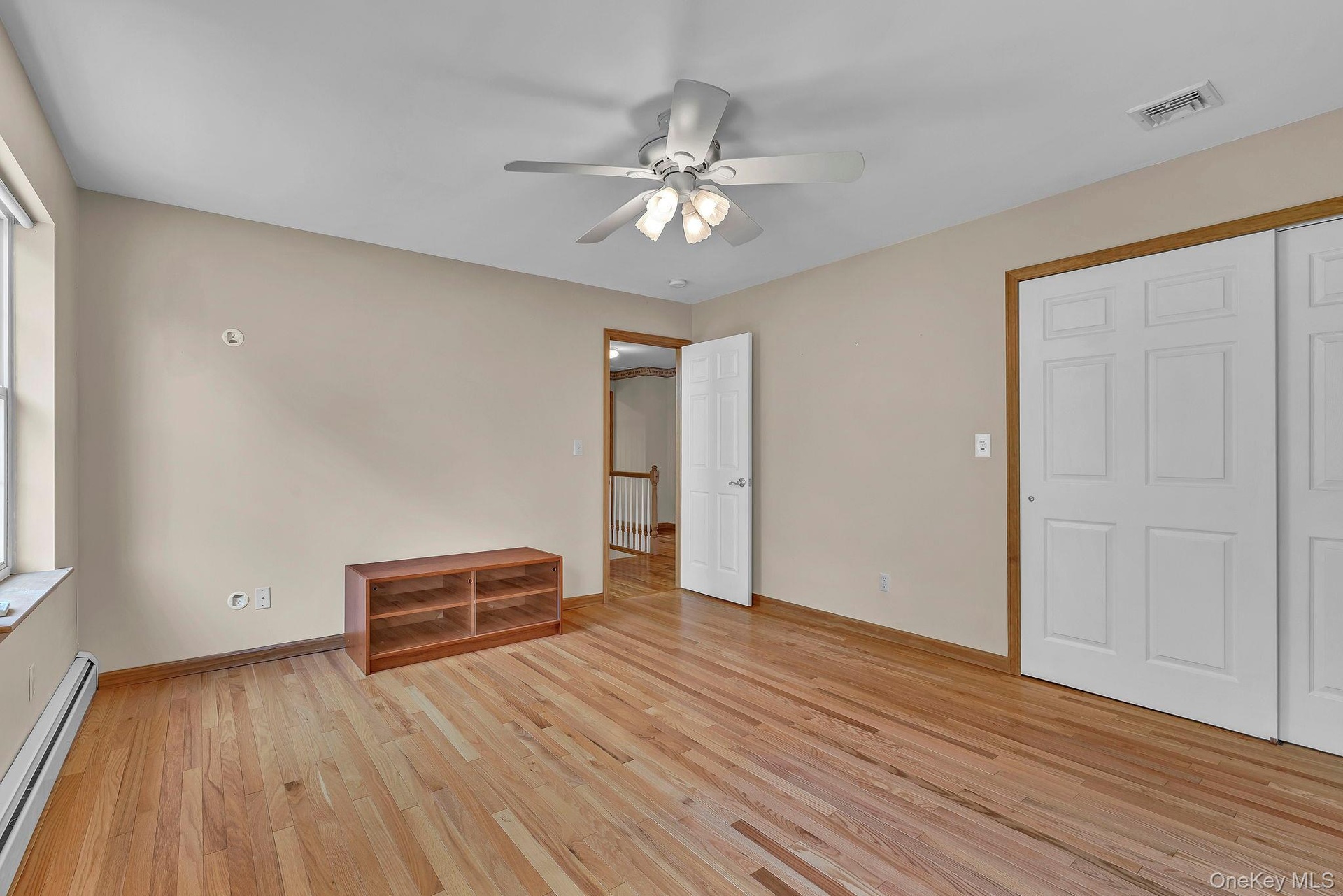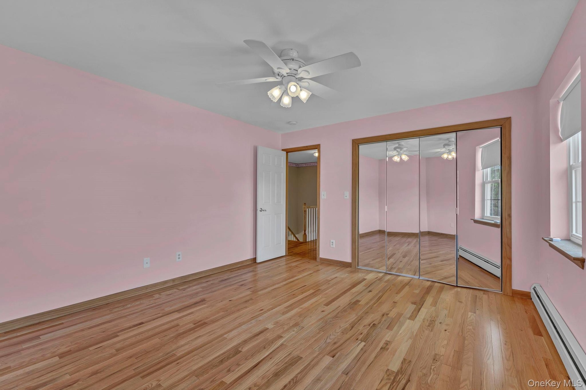 - Unfurnished bedroom featuring baseboard heating, a baseboard heating unit, light wood finished floors, a closet, and ceiling fan