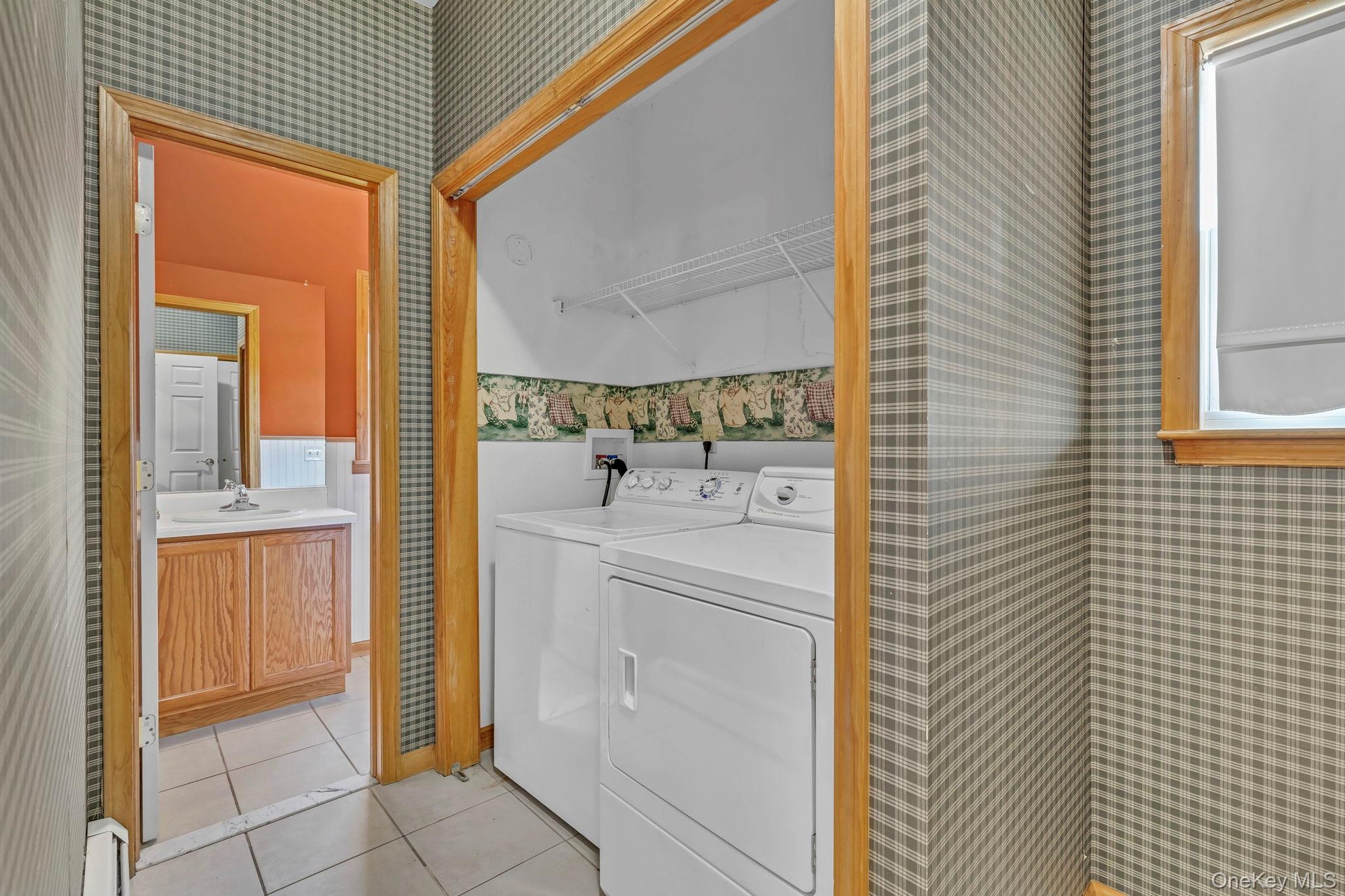 - Laundry area with wallpapered walls, light tile patterned flooring, and washer and dryer