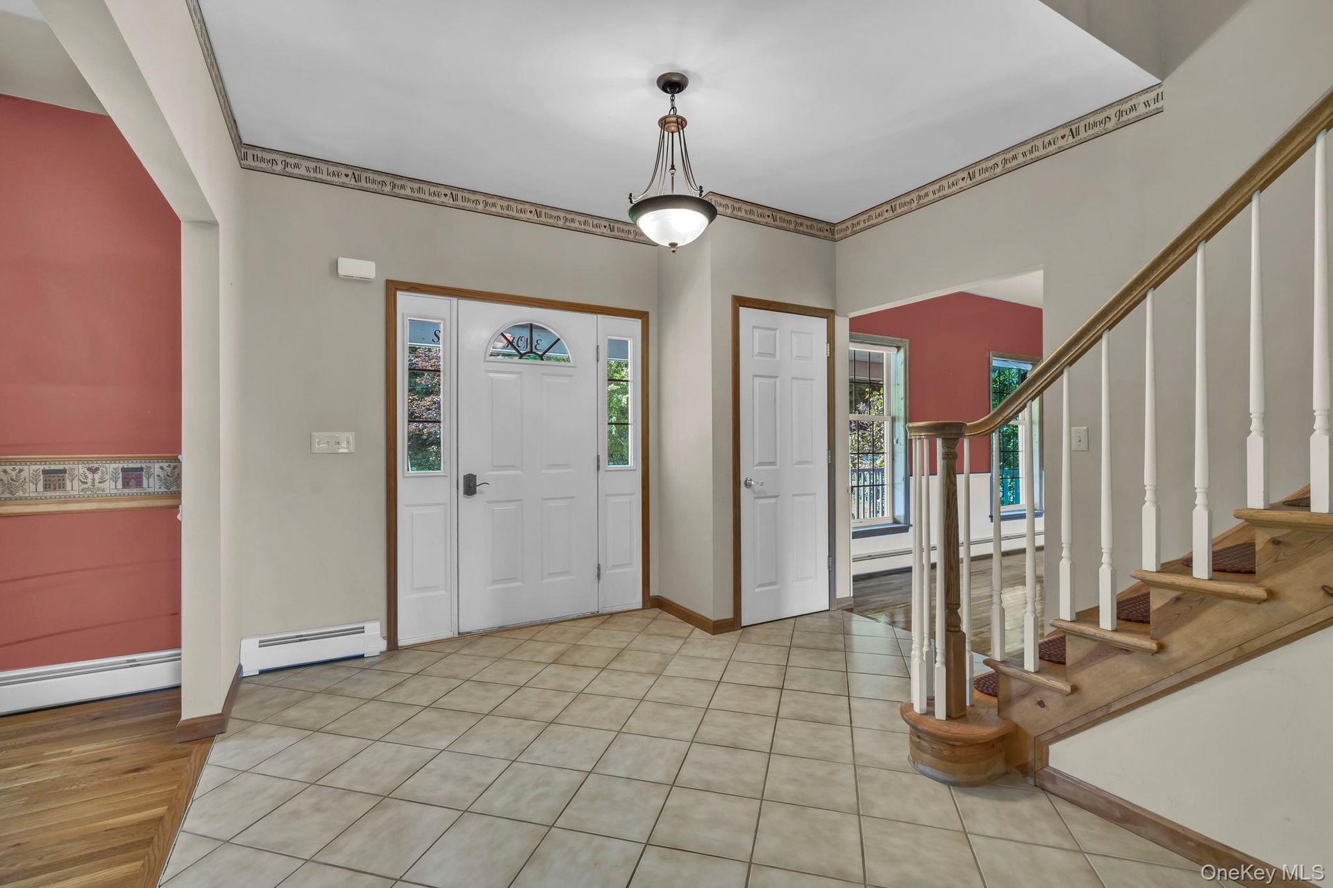 - Entrance foyer featuring a baseboard heating unit, baseboards, and stairway