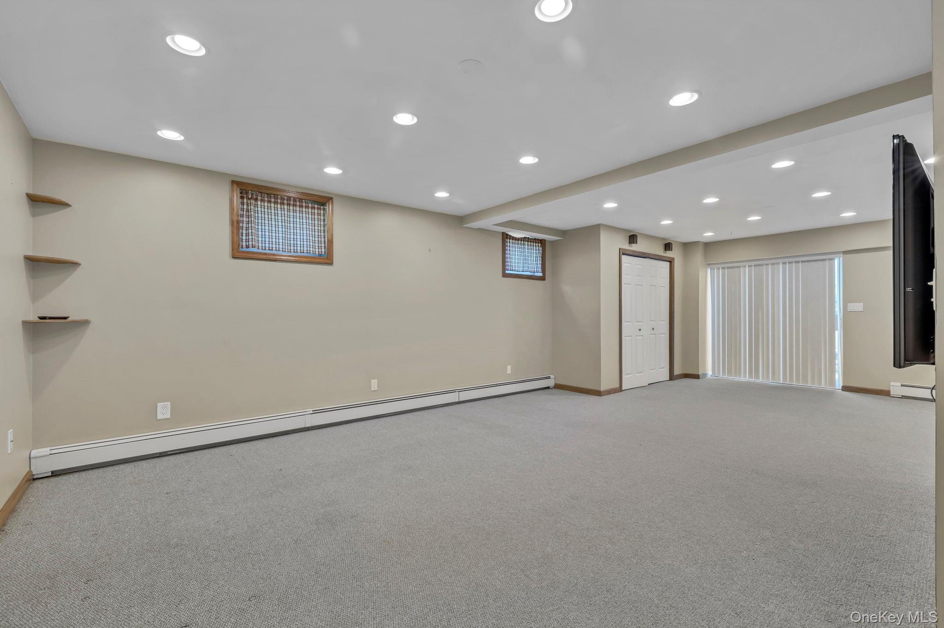 - Finished below grade area with light carpet, recessed lighting, baseboards, and a baseboard heating unit