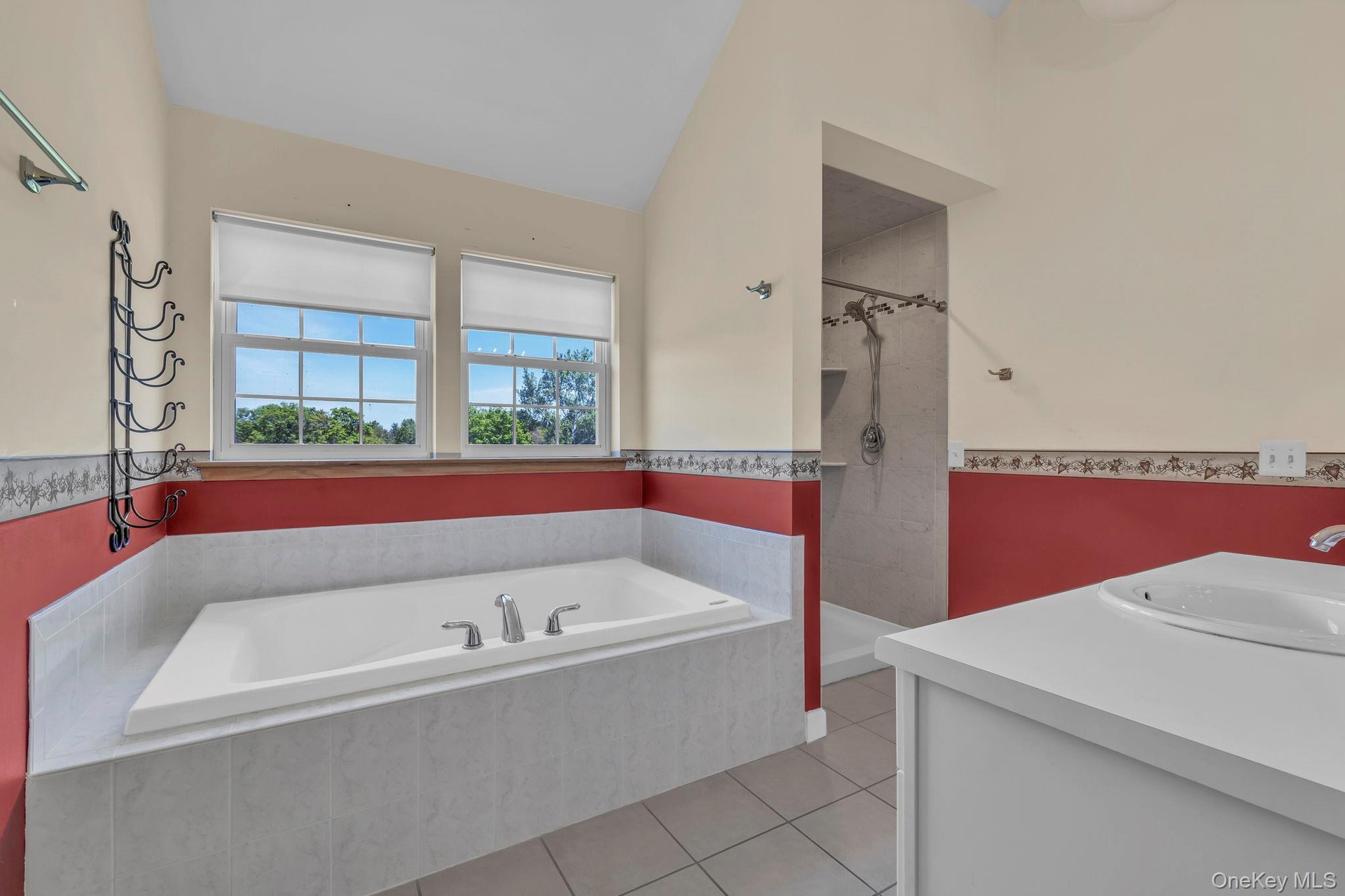 - Bathroom featuring a garden tub, a tile shower, tile patterned flooring, vanity, and lofted ceiling