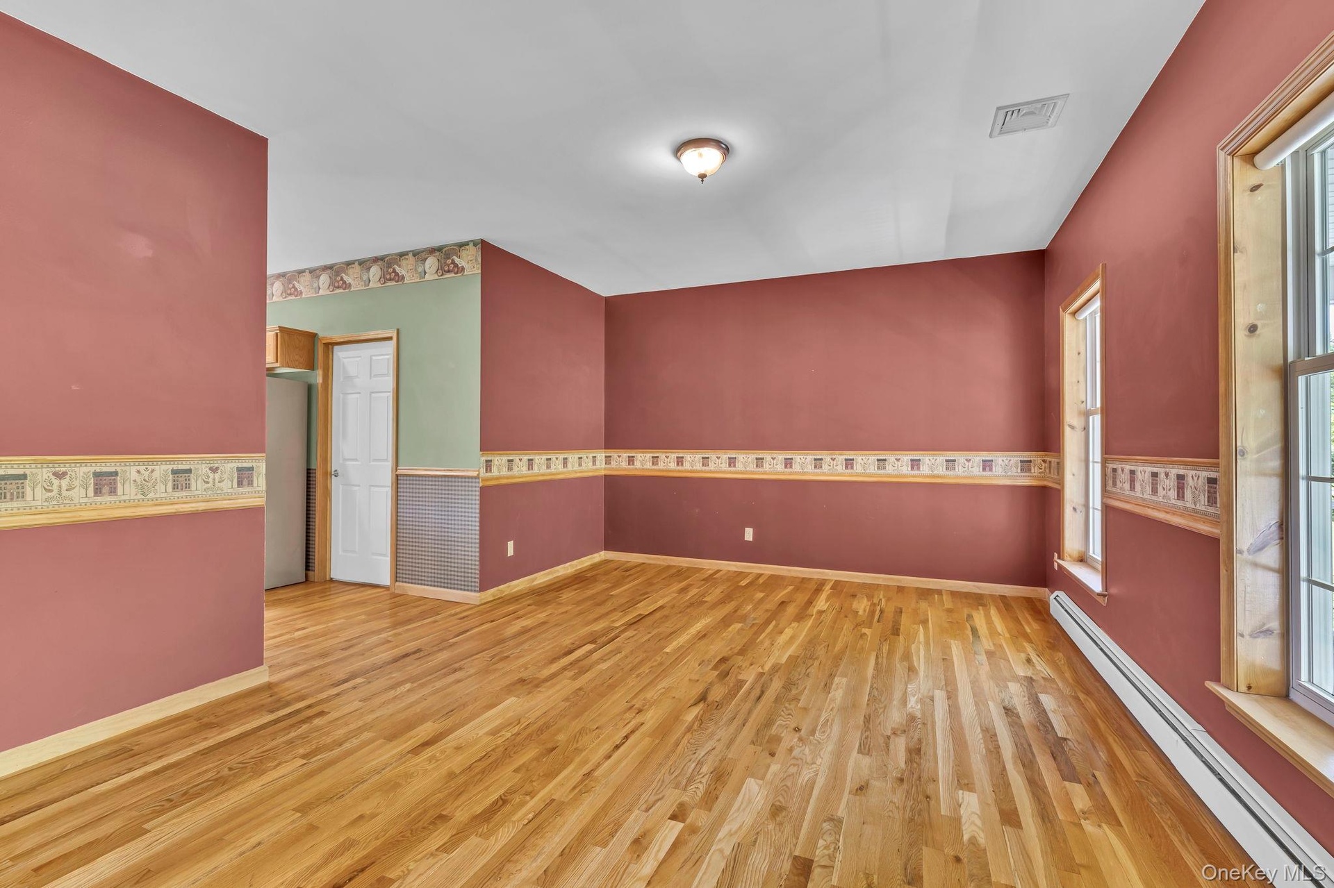 - Unfurnished room featuring baseboard heating, wood finished floors, and baseboards