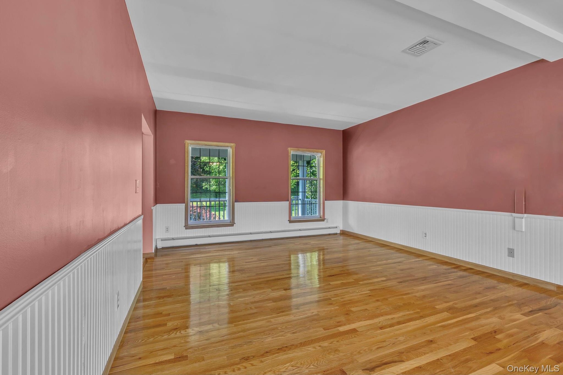 - Empty room with wainscoting, a baseboard radiator, and wood finished floors