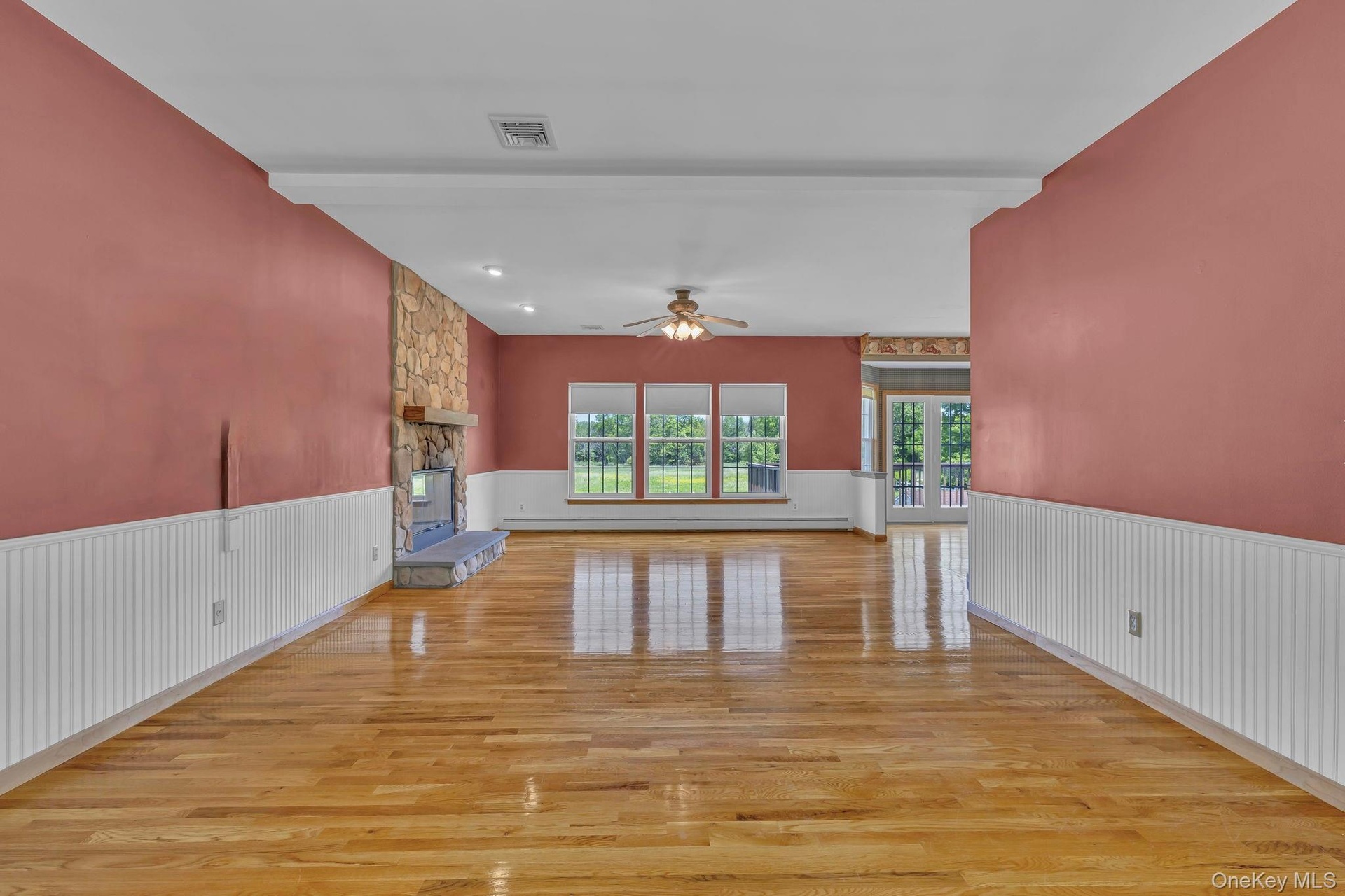 - Unfurnished living room with wood finished floors, a baseboard heating unit, a wainscoted wall, a ceiling fan, and a stone fireplace