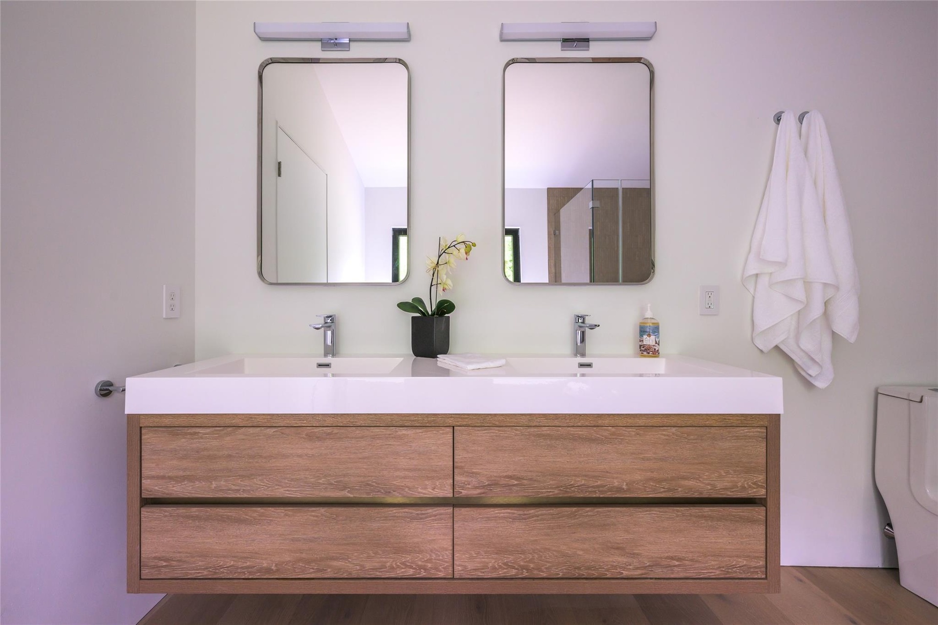 - Full bathroom with double vanity and toilet