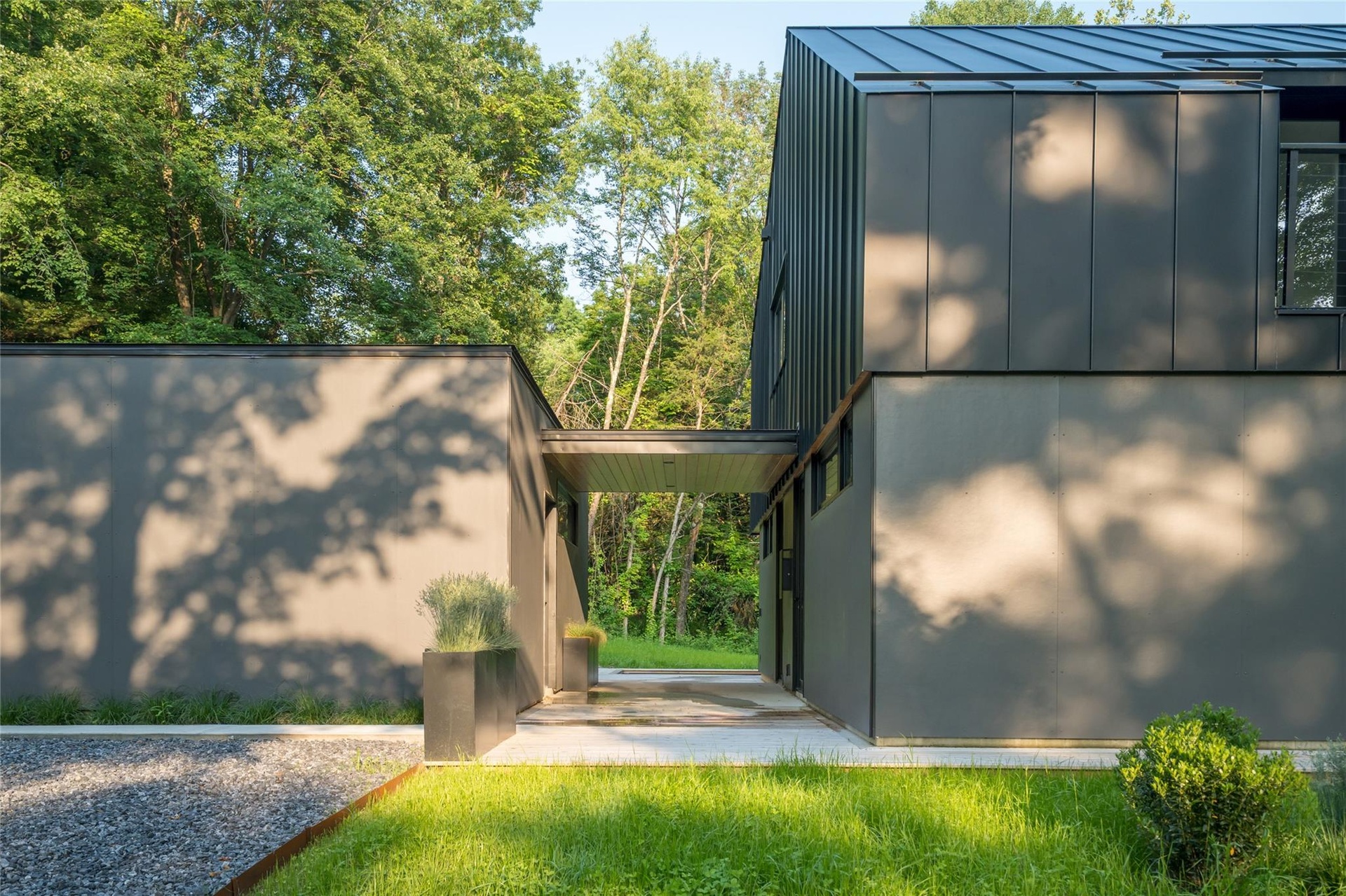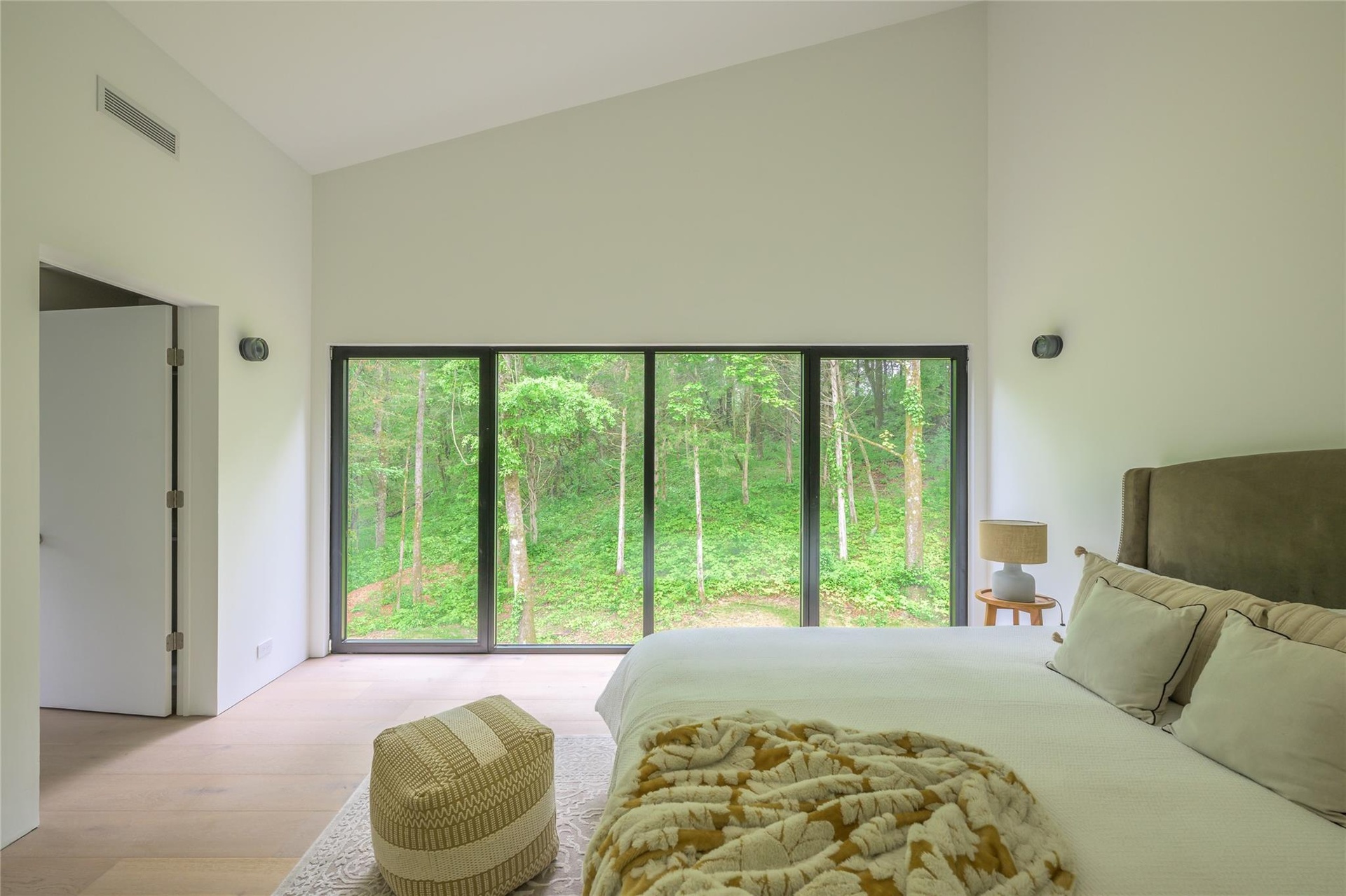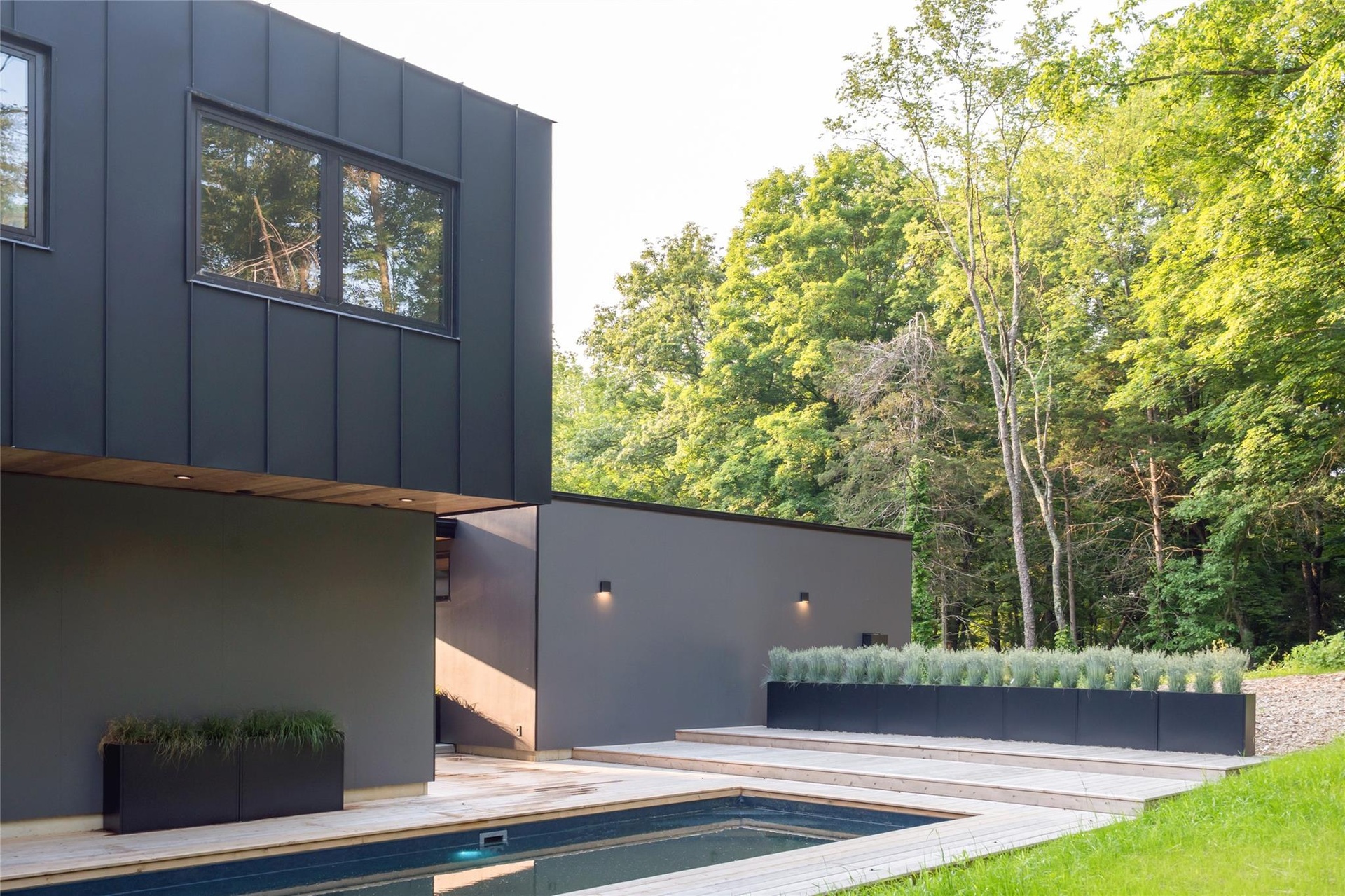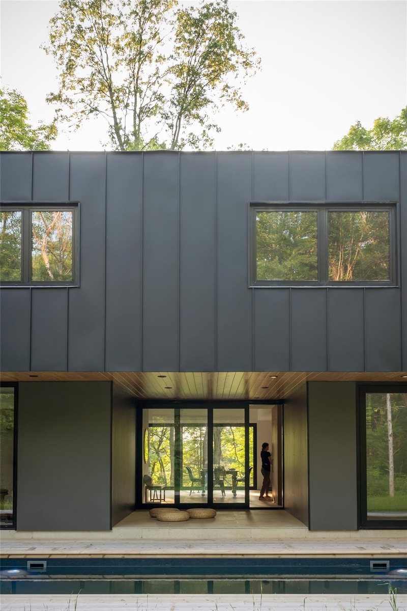 Natural finishes—from wide white oak floorboards and cedar decking to wood-clad interior walls—imbue warmth and authenticity throughout. Large-format porcelain pavers grace the first floor, while European aluminum windows ensure durability and design integrity. The home's envelope features closed-cell spray insulation and is topped with a low-maintenance standing seam metal roof, underscoring its energy efficiency and long-term resilience.