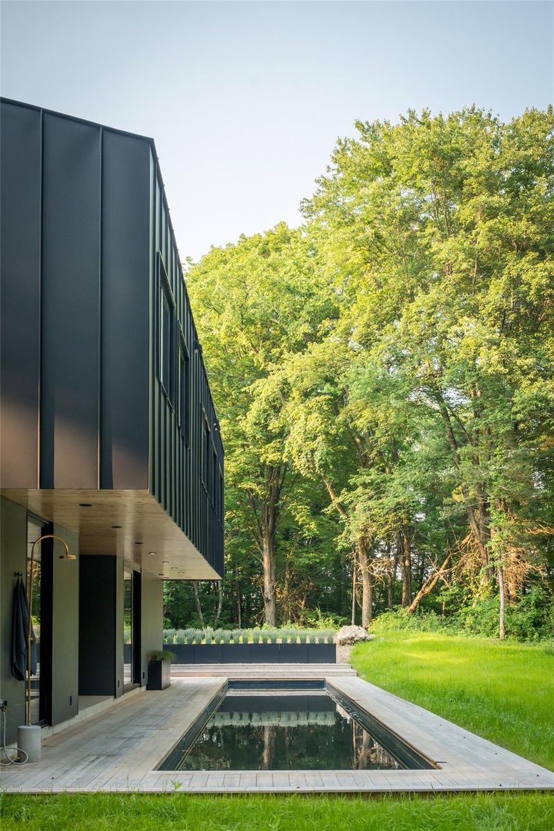 At the heart of the home, a 60-foot lap pool runs parallel to the main structure, fully accessible through oversized glass sliders that dissolve the line between house and landscape. A suspended bio-ethanol fireplace creates a dramatic yet cozy focal point in the den, from soaring double-height living spaces to quiet, cocooned bedrooms—enhance the emotional texture of the home.