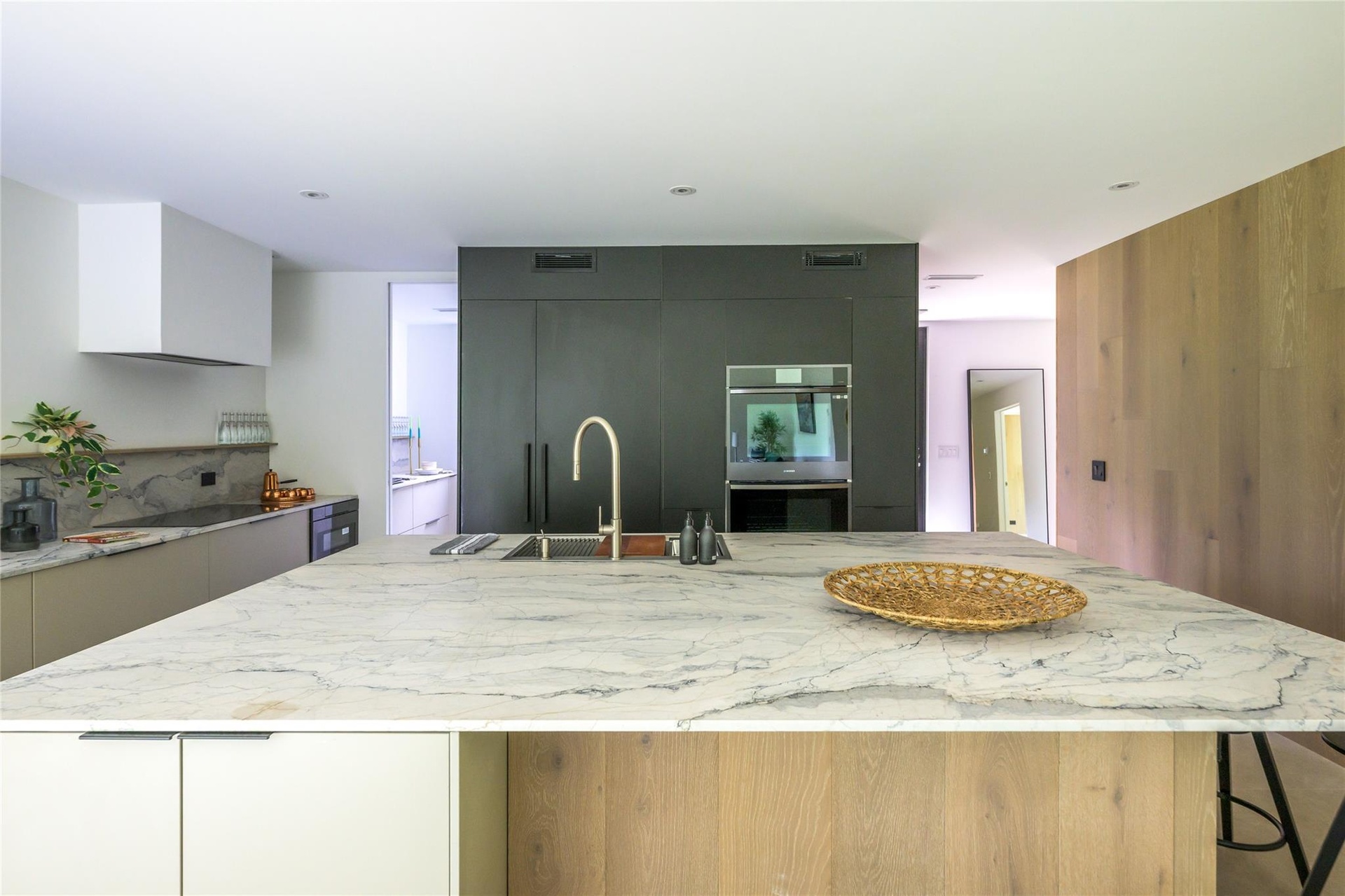 - Kitchen with modern cabinets, double oven, a sink, a large island, and light stone counters